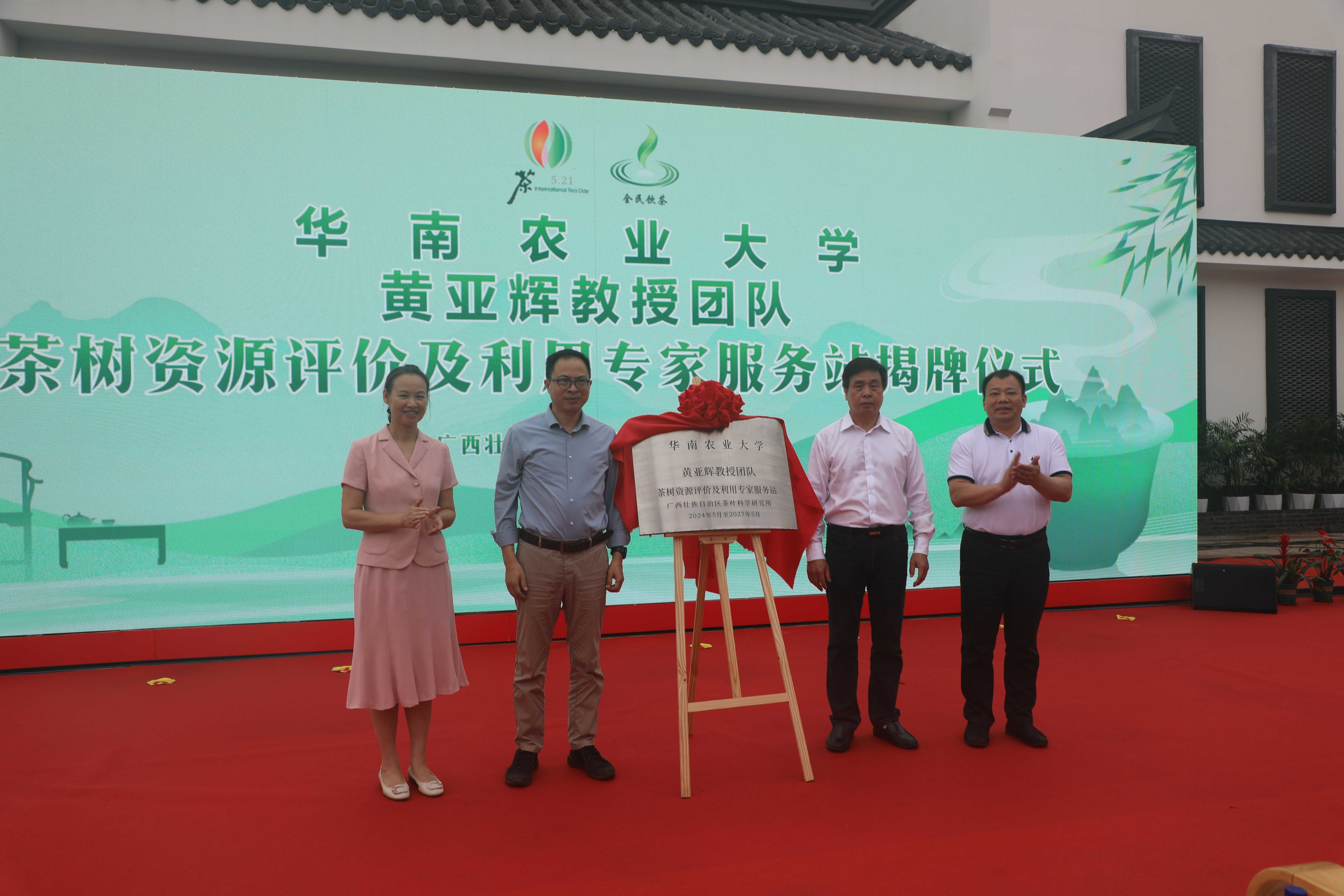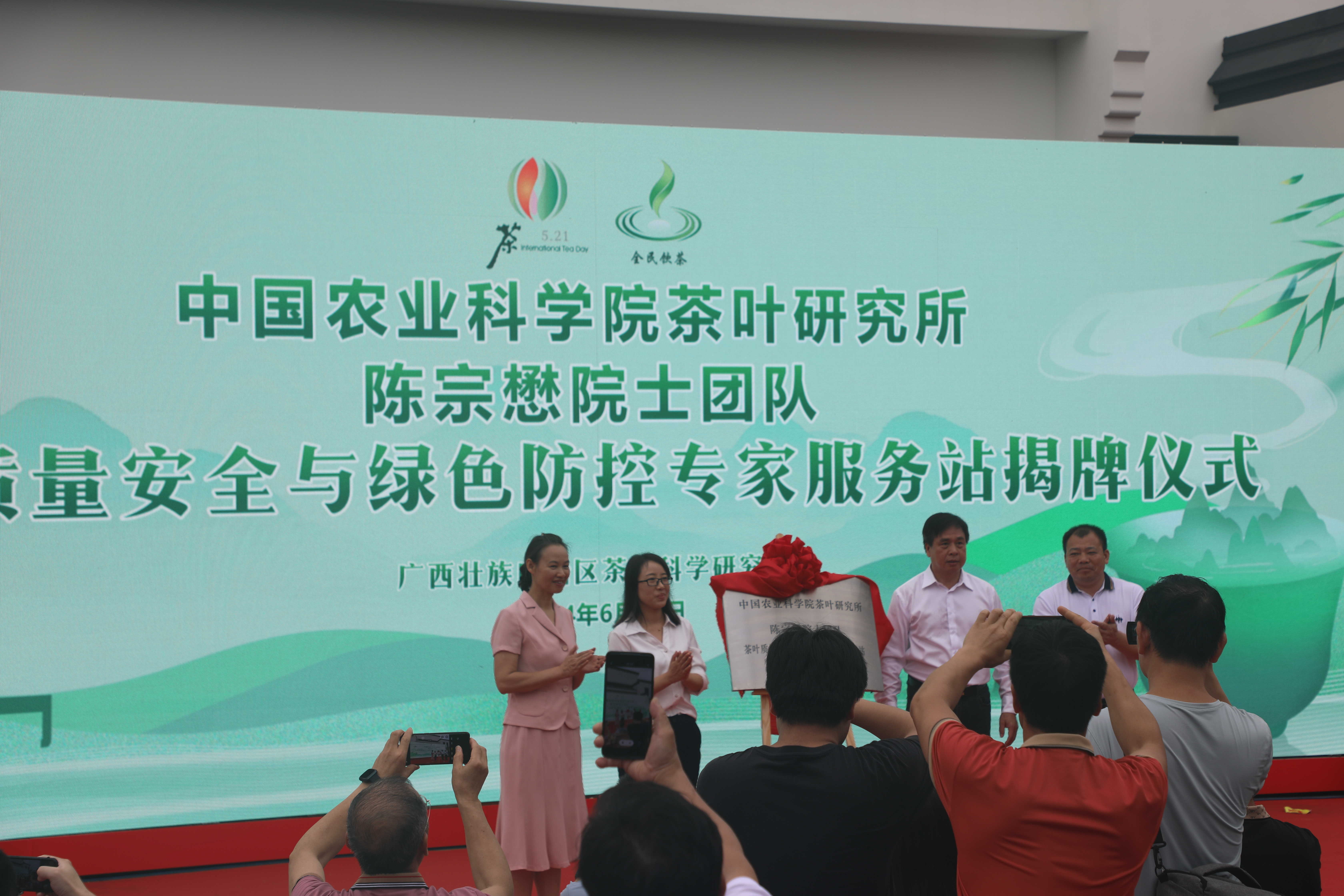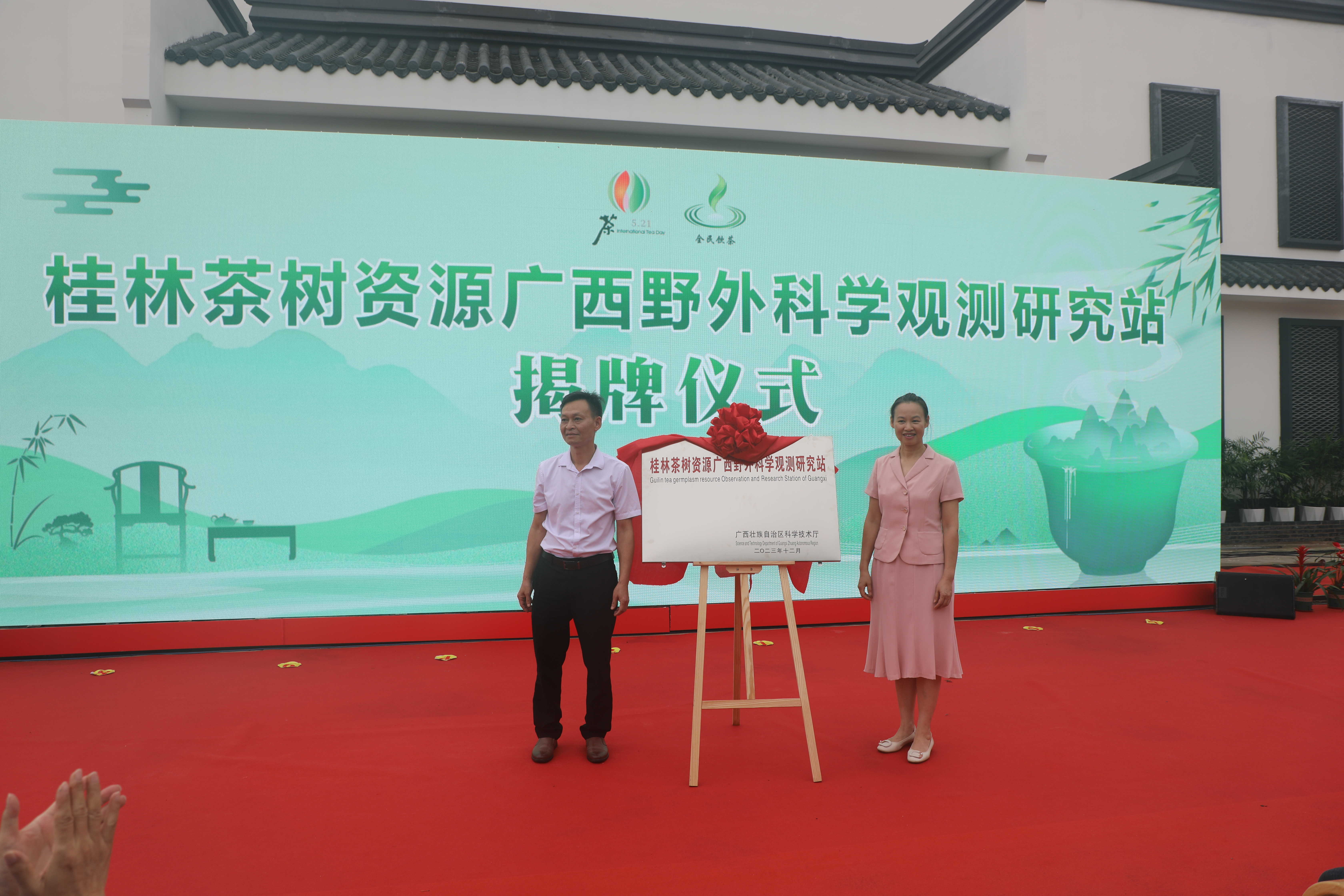 活动中,广西成人直播 厅科技处处长左明和广西茶科所副所长苏敏共同为“桂林茶树资源广西野外科学观测研究站”揭牌。此外还进行了华南农业大学黄亚辉教授团队“茶树资源评价及利用专家服务站”、中国农科院茶叶研究所陈总懋院士团队“茶叶质量安全与绿色防控专家服务站”、“广西科普教育基地”揭牌仪式。