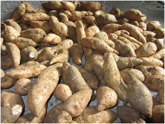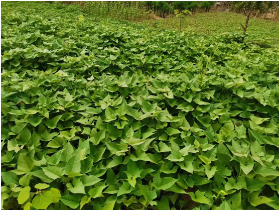 “大化白玉薯”外在感官特征:系旋花科甘薯属,一年生草本植物,植株匍匐生长,顶叶、叶脉、叶柄、茎均为绿色,叶形为浅裂单缺刻形,茎粗为0.3-0.5厘米,分枝4-8条,蔓长90-190厘米,花为漏斗状,中间为紫色,边缘为白色。薯块呈纺锤形,刚采收时薯块呈白皮白心,在自然条件下贮存皮呈浅黄色,一般单株结薯3-4个,单薯重80-600克,切开鲜薯块浸出乳白浆液,蒸煮熟后薯肉呈白玉状,口感粉、香、甜。加工成的粉条呈淡褐色,半透明状,煮熟后口感爽滑、韧性好。