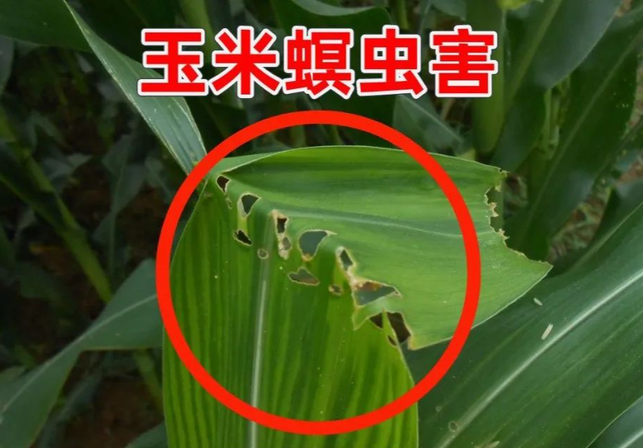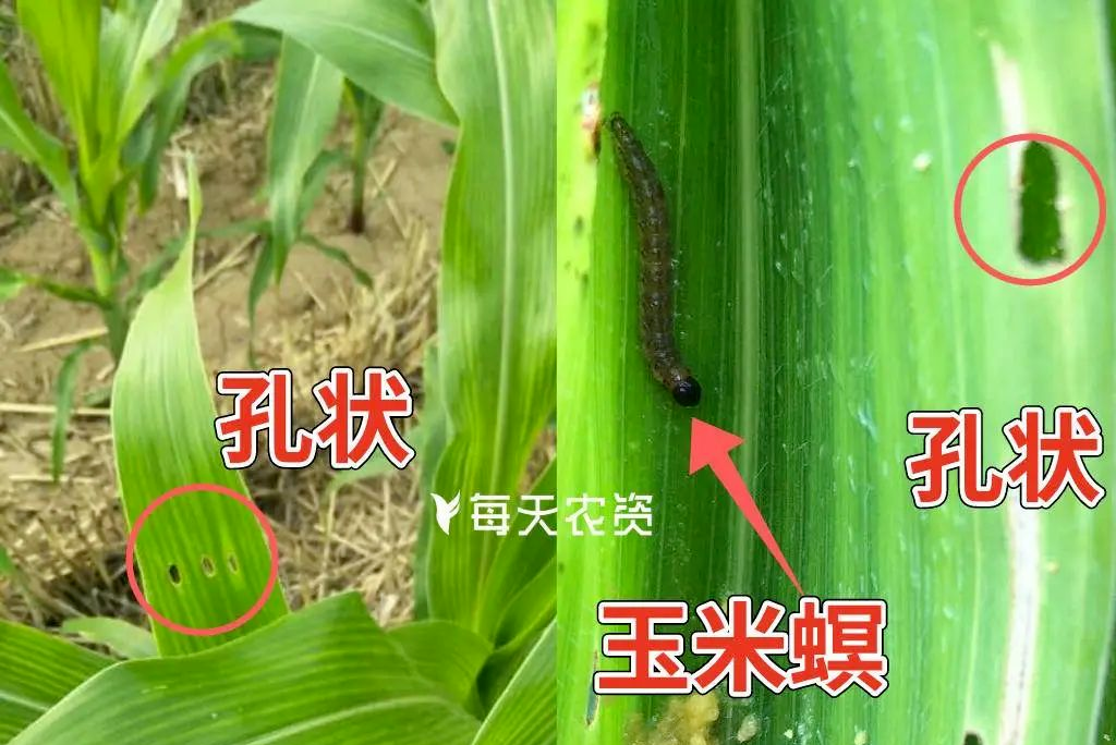 玉米螟主要发生在6-9月份,玉米螟会爬到作物叶片上啃食作物,啃食后叶片会留下孔状,如下图