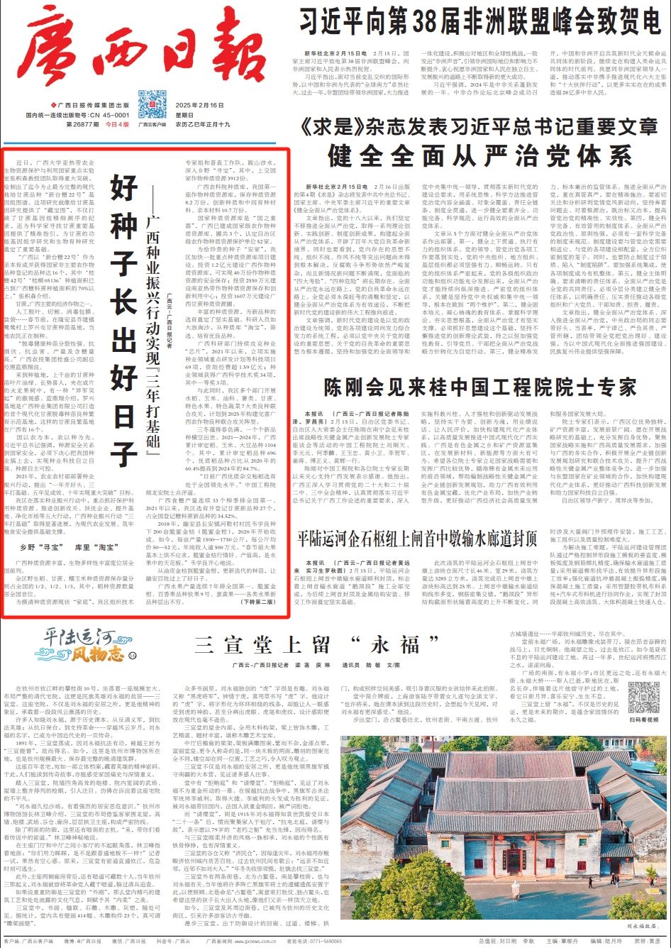 广西科研部门持续攻克种业“芯片”,2021年以来,立项实施种业领域重点研发计划等科技项目69项,资助经费超1.59亿元;种业领域获得广西科学技术奖34项,其中一等奖3项。