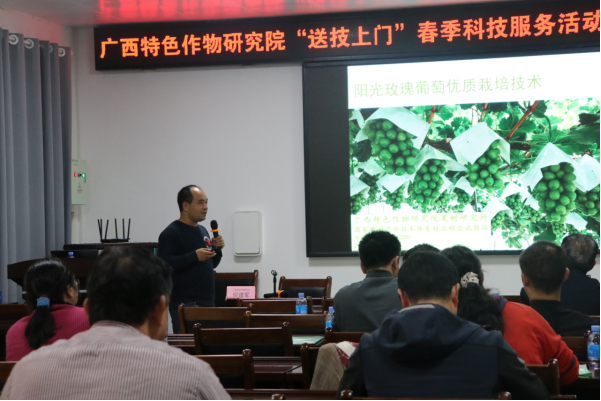 一年之计在于春,春耕农时不等人。为帮助兴安县创建兴安葡萄广西特色农产品优势区, 4月12日,广西特色作物研究院葡萄科研团队赴兴安开展“送技上门”春季科技服务活动,举办葡萄种植技术知识培训活动。