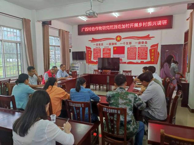 广西特作院乡村振兴领导小组对驻村工作队和村两委提出的总体产业发展要求给出建议。一是在产业方面,充分发挥连加村特色产业优势,打造连加村特色红薯品牌,结合电商平台,进一步做大做强;二是通过引进龙头企业,打造现代化农业科技大棚示范引领,进一步发挥联农带农作用。