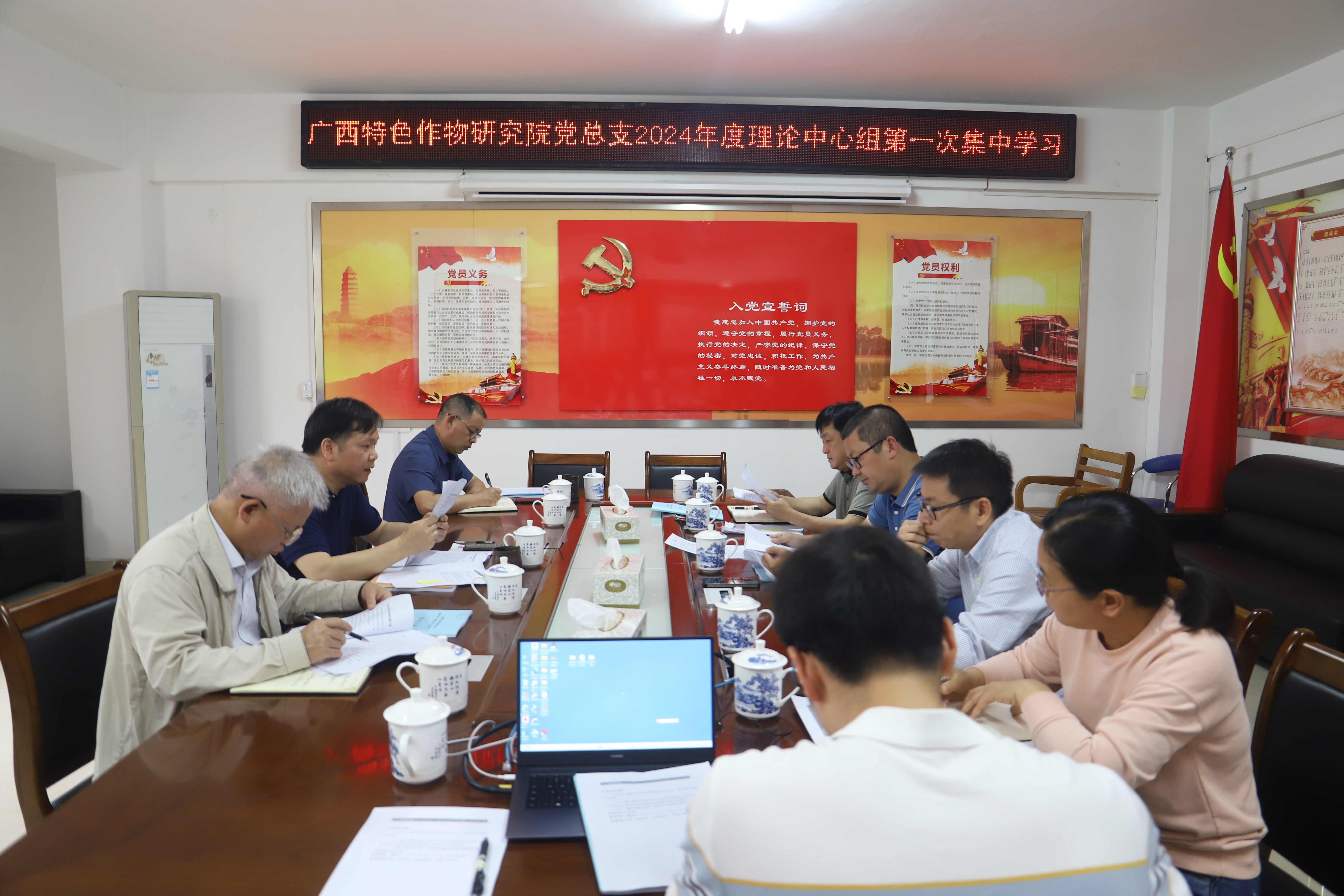 4月15日,广西特色作物研究院党总支召开2024年理论学习中心组第一次集中学习暨理论读书班,广西特色作物研究院党总支书记、院长郭小强主持会议并讲话,院处级领导及院属各部门负责人参加会议。