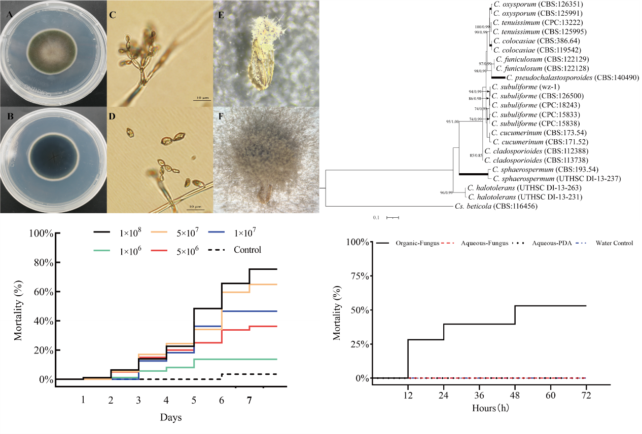 近日,我院娄兵海研究员团队与西南大学蒋红波教授团队合作在国际学术期刊Egyptian Journal of Biological Pest Control上发表题为“Novel isolate of Cladosporium subuliforme and its potential to control Asian citrus psyllid, Diaphorina citri Kuwayama (Hemiptera: Liviidae)”的研究论文。该论文在野外柑橘木虱身上鉴定到一种新的昆虫病原真菌,分离纯化后,经形态学和多基因联合建树,将其鉴定Cladosporium subuliforme。该菌是作为昆虫病原真菌的首次报道,用1 × 108个/mL的孢子浓度处理试虫,柑橘木虱7 d的累积死亡率达到75.27%,表明其具有良好的生物防治潜力。此外,研究还对该菌的代谢产物进行了提取分析,推测了潜在的杀虫活性物质。