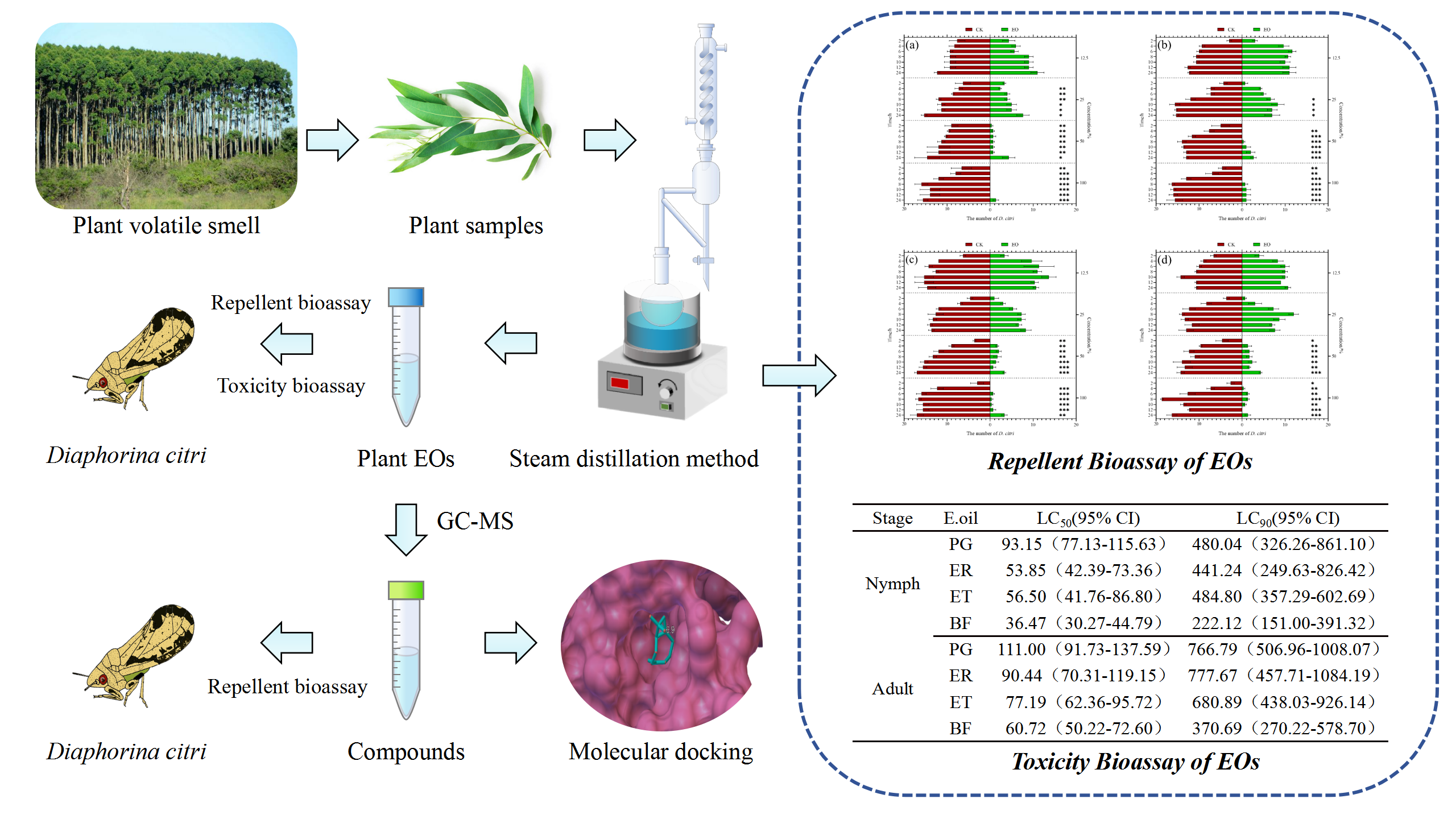 昆虫的嗅觉系统在气味识别中起到关键作用,以气味结合蛋白为靶点,干扰昆虫的取食行为,是一种有效而且环境友好的防治方法。团队成员调查了大叶桉、细叶桉和岗松三种非寄主植物挥发油对柑橘木虱的驱避效果,并分析了其化学成分和作用机制。研究结果表明,上述三种挥发油对柑橘木虱均有良好的驱避作用,效果最强的大叶桉挥发油24小时驱避率超过85%,GC-MS分析表明,单萜化合物Eucalyptol是该挥发油的有效成分之一,其驱避效果超过了阳性对照药物β-石竹烯,计算机模拟分子对接发现Eucalyptol与柑橘木虱的气味结合蛋白DcitOBP7有较强的结合作用,且有特殊的结合位点。这些结果揭示了挥发油中的烯萜类成分可通过与柑橘木虱的气味结合蛋白结合,影响柑橘木虱的取食行为,从而避免其传播柑橘黄龙病菌;另一方面,大叶桉是我国大规模栽培的经济树种,与柑橘主产区重合,产量大、成本低,具备潜在的应用价值。