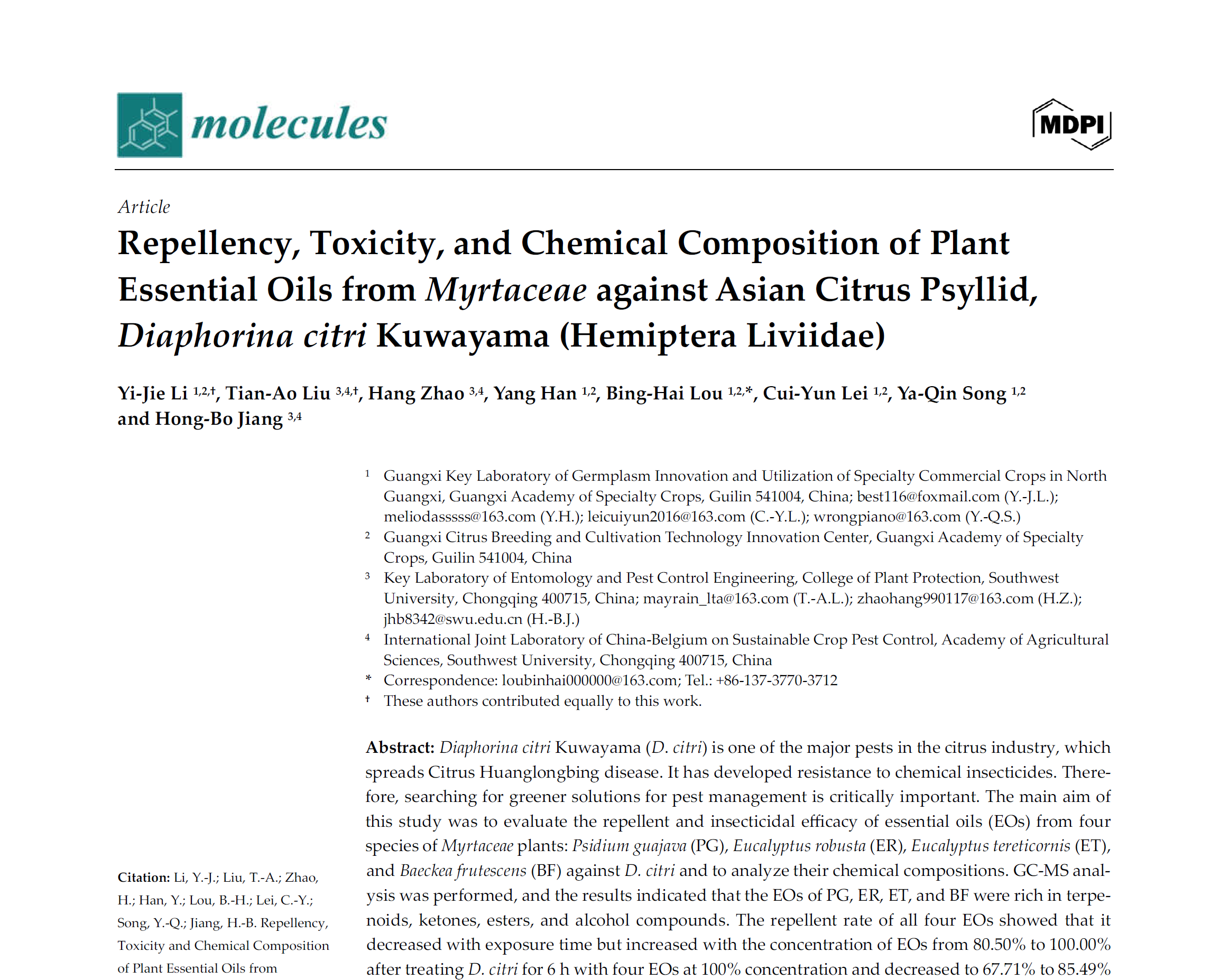 近日,广西特色作物研究院柑橘病虫害可持续防控团队在化学二区期刊《Molecules》(IF2023=4.2)发表题为“Repellency, Toxicity, and Chemical Composition of Plant Essential Oils from Myrtaceae against Asian Citrus Psyllid, Diaphorina citri Kuwayama (Hemiptera Liviidae)”的研究论文。