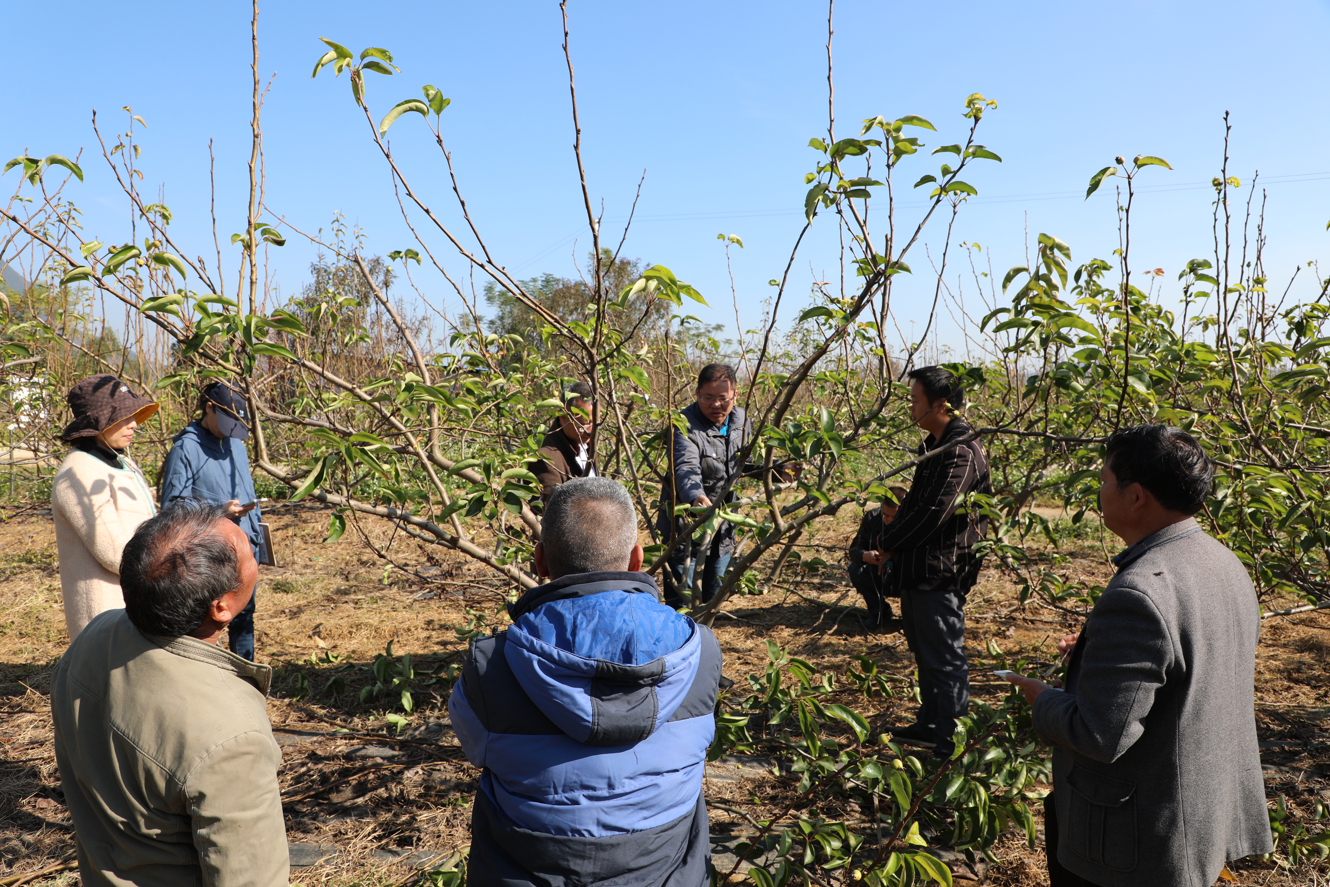 在锦绣梨园家庭农场,试验站一行详细了解种植户在梨生产过程中遇到的问题,针对性地提出解决方案,同时深入浅出地讲解了梨树冬季整形修剪的要点,并与种植户一起对园内的幼年树和初结果树进行修剪,通过技术讲解培训,加深了种植户对梨树整形修剪的理解,增强了种植户发展梨产业的信心。