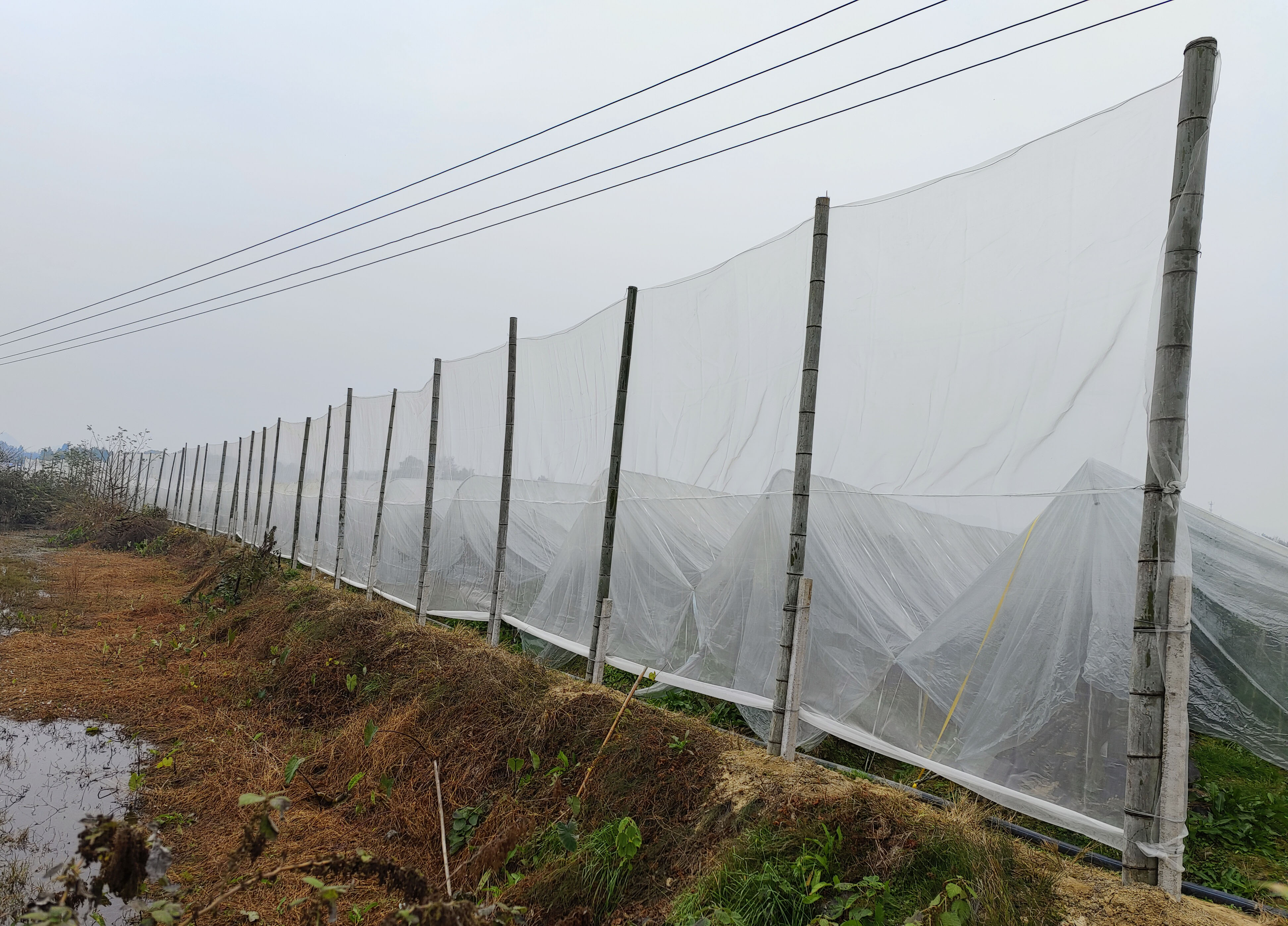 试验基地位于桂林市全州县文桥镇,全州县地处湘桂走廊,南北气流通道明显,风力大,易造成柑橘伤果和落叶,基地主要种植有脆蜜金柑、默科特、脐橙等柑橘品种。为防止大风对柑橘栽培的影响,广西特色作物研究院柑橘栽培科研人员肖远辉副研究员、门友均助理研究员通过对大风主要吹刮方向进行研判后,在基地上风口处设置10米高的塑料防风大网,减轻柑橘风害受损。试验结果显示,在大风风害明显区域,设置塑料防风大网能有效减轻大风对柑橘果实和叶片的伤害,明显提高柑橘产量。