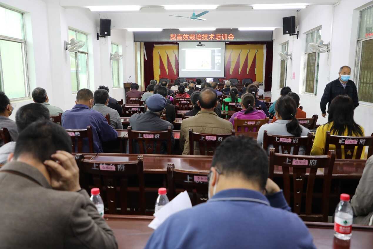 5月16日,依托于广西特色作物研究院的国家梨产业技术体系桂林综合试验站为贯彻落实国家科技特派团广西天等团的工作,针对当前广西壮族自治区崇左市天等县梨产业存在的问题和技术需求,分别在天等县上映乡、返乡创业园举办了“梨高效栽培技术培训会”和“早熟梨贮运保鲜与电商销售技术培训会”,国家梨产业技术体系首席科学家、岗位专家、试验站站长通过线上线下进行授课培训,参加培训会的人员主要有当地梨种植大户、县乡科技特派员、农技推广人员以及县委组织部、工信局、成人直播 局、商务局、上映乡政府等部门领导,共150余人。会后,试验站团队专家在当地梨园就结果枝培育与更新、拉枝整形、疏果、病虫害识别与防治等技术进行现场示范与指导,广大果农反映在梨树生长的关键节点举办这样的现场培训会直观易掌握,效果好,收益很大。