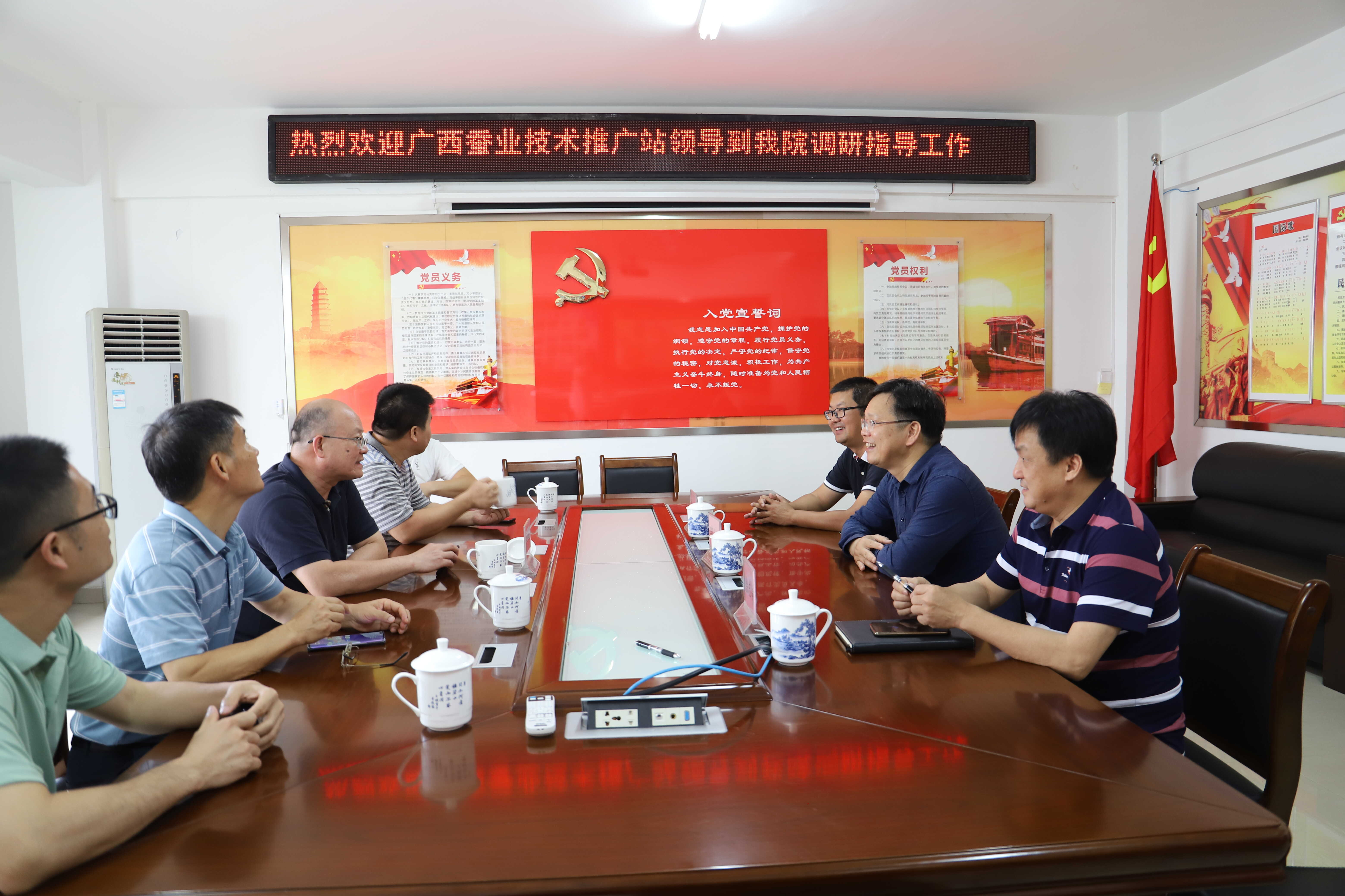 6月8日,自治区蚕业技术推广站站长李标带调研组一行到广西特色作物研究院开展调研交流,广西特色作物研究院院长郭小强,副院长徐志美、刘升球及院办公室等部门负责人参加调研交流。