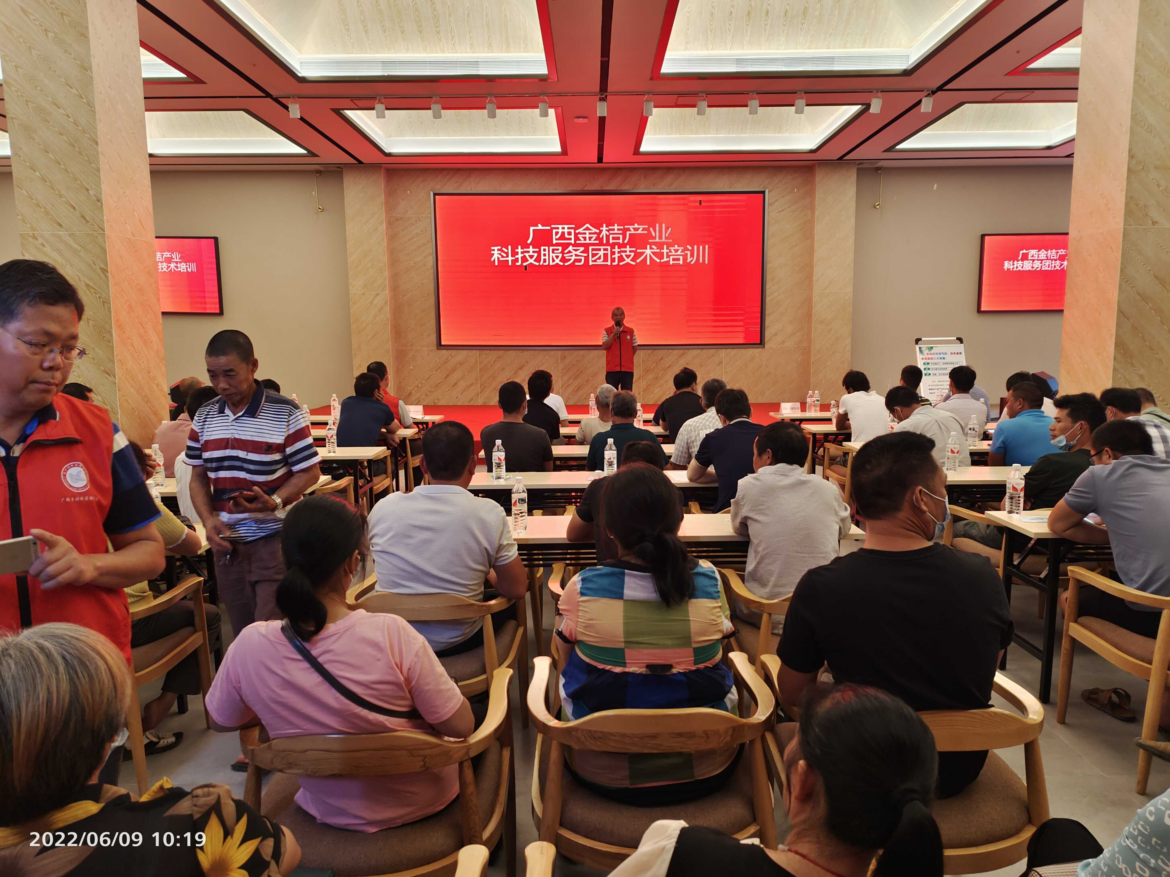 2022年6月9日上午,广西金橘产业科技服务团联合融安县农村专业技术协会、金桔行业协会在融安县举办脆蜜金柑花期管理技术培训班,邀请广西金橘产业科技服务团副团长邓光宙、秘书长门友均、广西特色作物研究院肖远辉副研究员、融安科协韦建勋主席、融安县成人直播 局吴齐仟站长等进行授课。