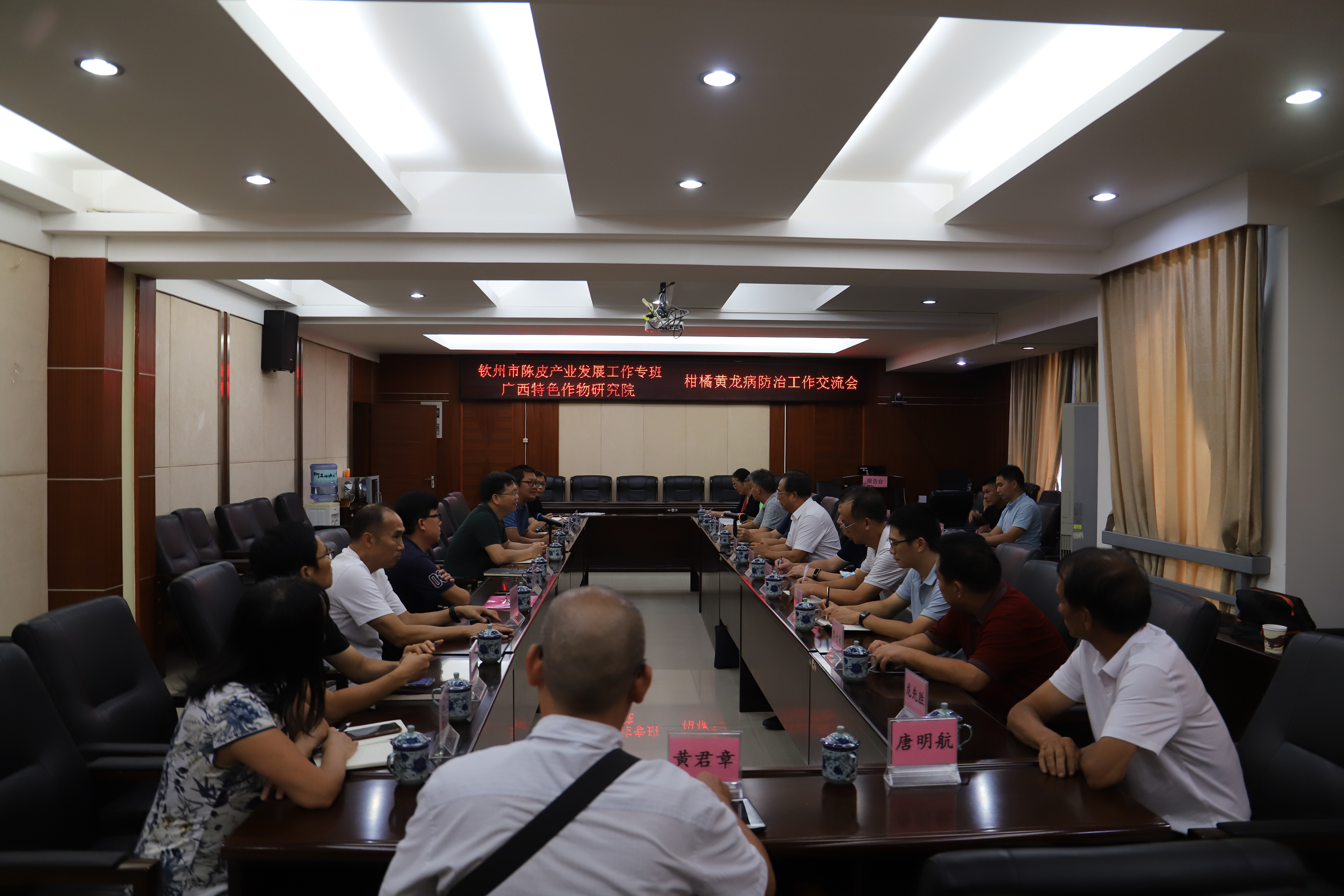 郭小强对调研组一行的到来表示欢迎,并向调研组介绍了广西特色作物研究院近年来科研工作进展情况,特别是在柑橘黄龙病防控方面的科研成效;李云昌对广西特色作物研究院取得的成绩表示称赞,简单介绍了钦州市陈皮产业发展情况。