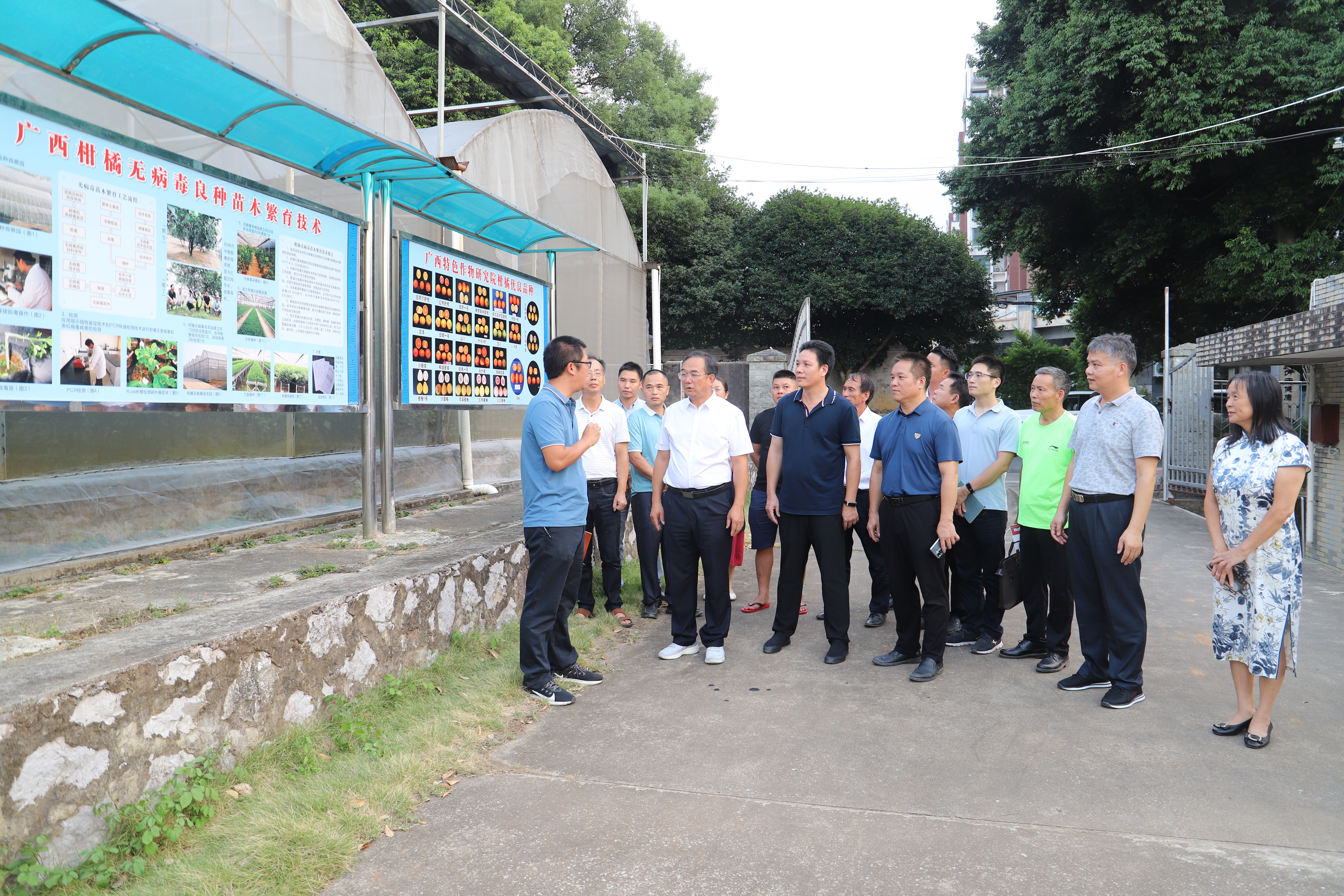 座谈会上,双方共同观看了广西特色作物研究院宣传视频片。会后,调研组一行实地参观考察了广西特色作物研究院无病毒苗圃繁育基地、柑橘种质资源苗圃基地。