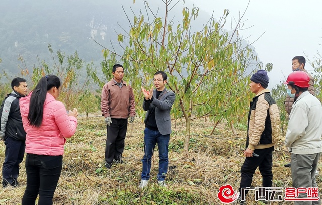 广西特色作物研究院果树专家现场指导农户管护桃树。