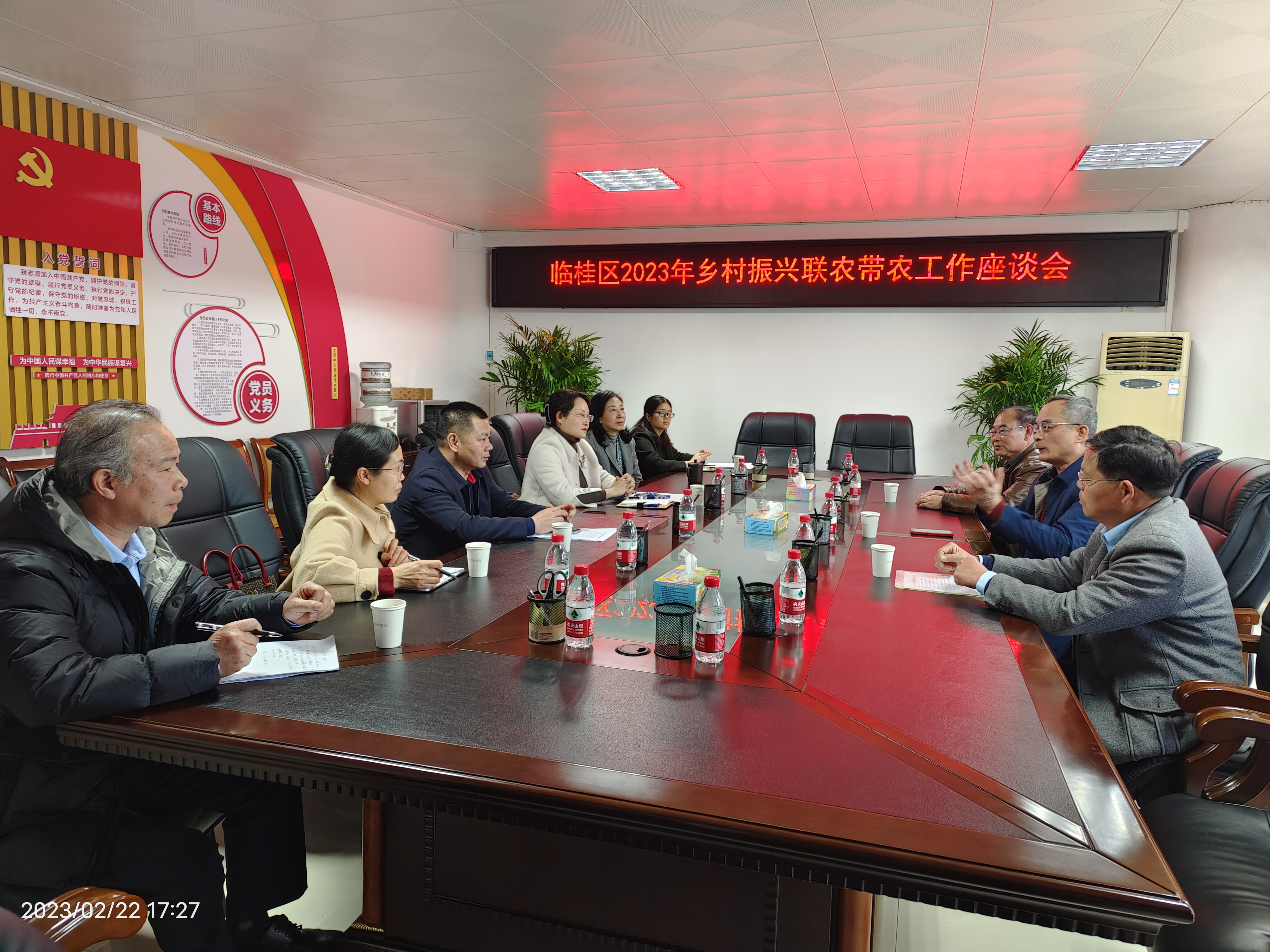 2月22日,广西特色作物研究院乡村振兴领导小组副组长常运涛(正处长级)带领门友均高级农艺师、王健研究员等专家,应邀赴桂林市临桂区参加2023年乡村振兴联农带农工作座谈会。