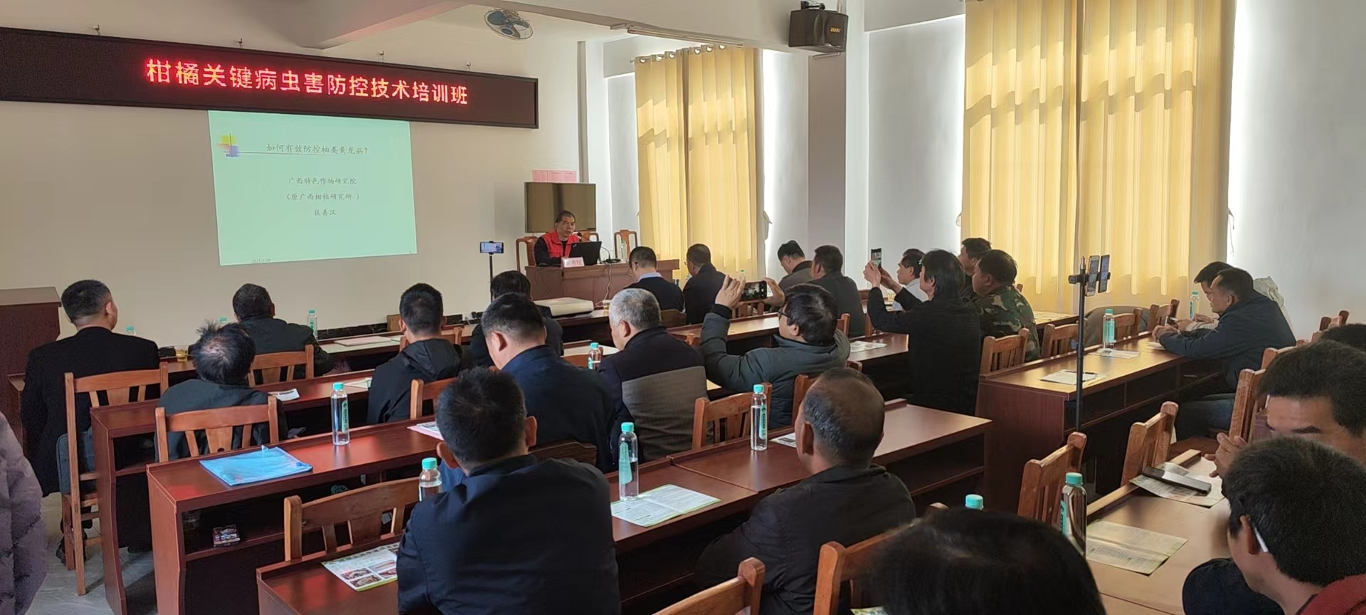 2023年2月28日,应玉林市农业科学院和容县水果产业服务中心邀请,广西特色作物研究院科技特派员区善汉研究员赴容县石寨镇下烟村村委会、下烟村苏孟兴果场现场授课讲解沙田柚栽培技术,来自容县县直、乡镇农业部门及沙田柚协会的90名技术人员、果农参加了培训。