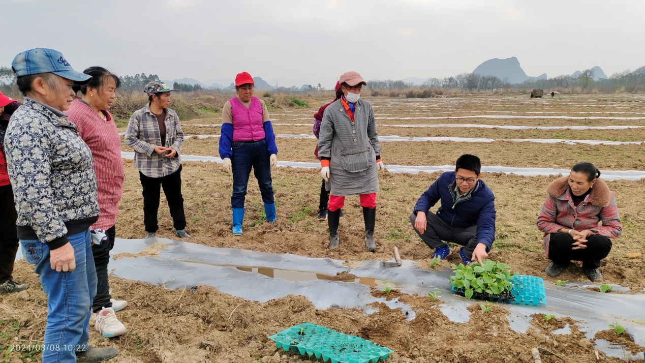 2024年3月8日,广西特色作物研究院蔬菜研究所乡村科技特派员王红梅高级农艺师、贺申魁高级农艺师到七星区开展蔬菜栽培技术指导。