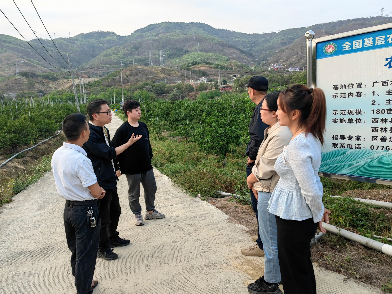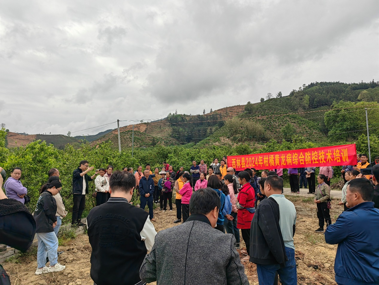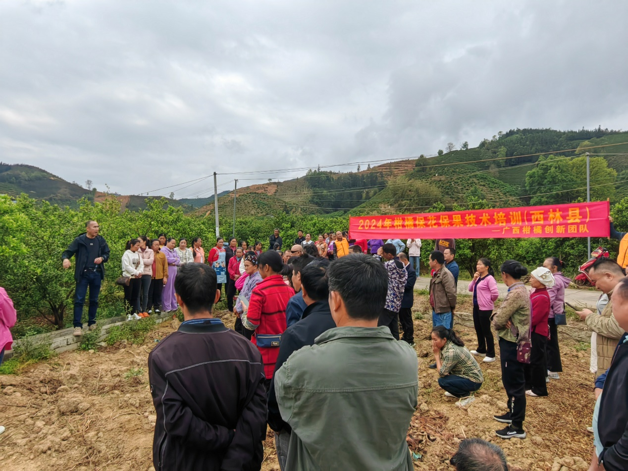 2024年4月7日至9日,广西柑橘创新团队副首席娄兵海研究员团队一行4人到桂西北站调研,并联合西林县成人直播 局在古障镇古障村开展黄龙病综合防控、保花保果等田间专题培训,培训乡镇农技员及果农117人次,先后实地指导西林县红程果园、右江区天兴农场等果园生产。