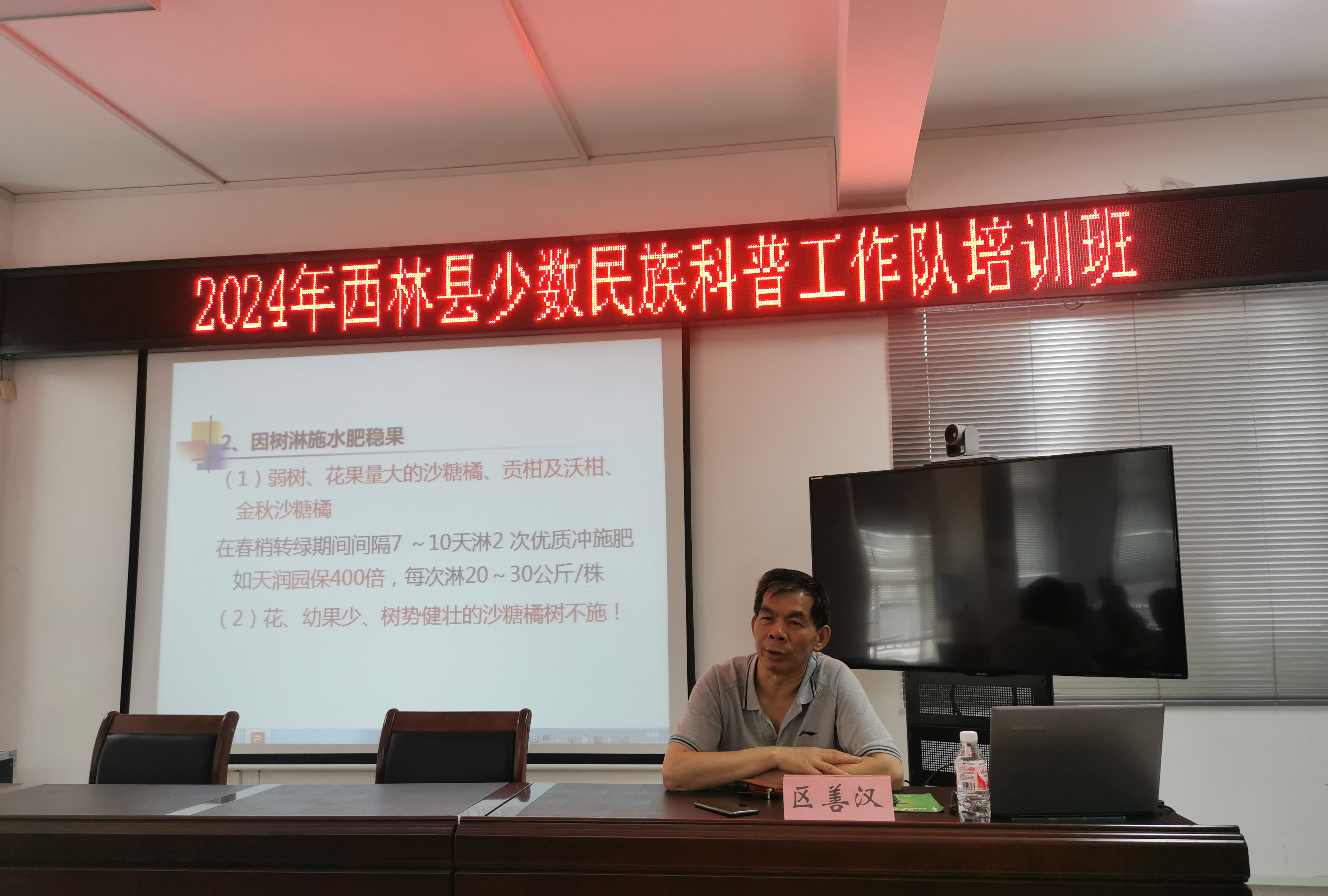 2024年4月18日上午,广西特色作物研究院科技特派员区善汉研究员,在西林县发改委会议室为来自西林县各个乡镇的50名沙糖橘种植大户作了题为“沙糖橘春夏季保果关键技术与如何有效防控柑橘黄龙病”的讲座,主要针对西林今年春季长期高温干旱、果园缺水等现状,重点介绍了沙糖橘生理落果的原因、巧施水肥与叶面肥缓解营养矛盾、合理使用生长调节剂保果、蓟马与红蜘蛛、黄龙病等病虫害防控等春夏季保果的关键技术,受到了学员的欢迎。