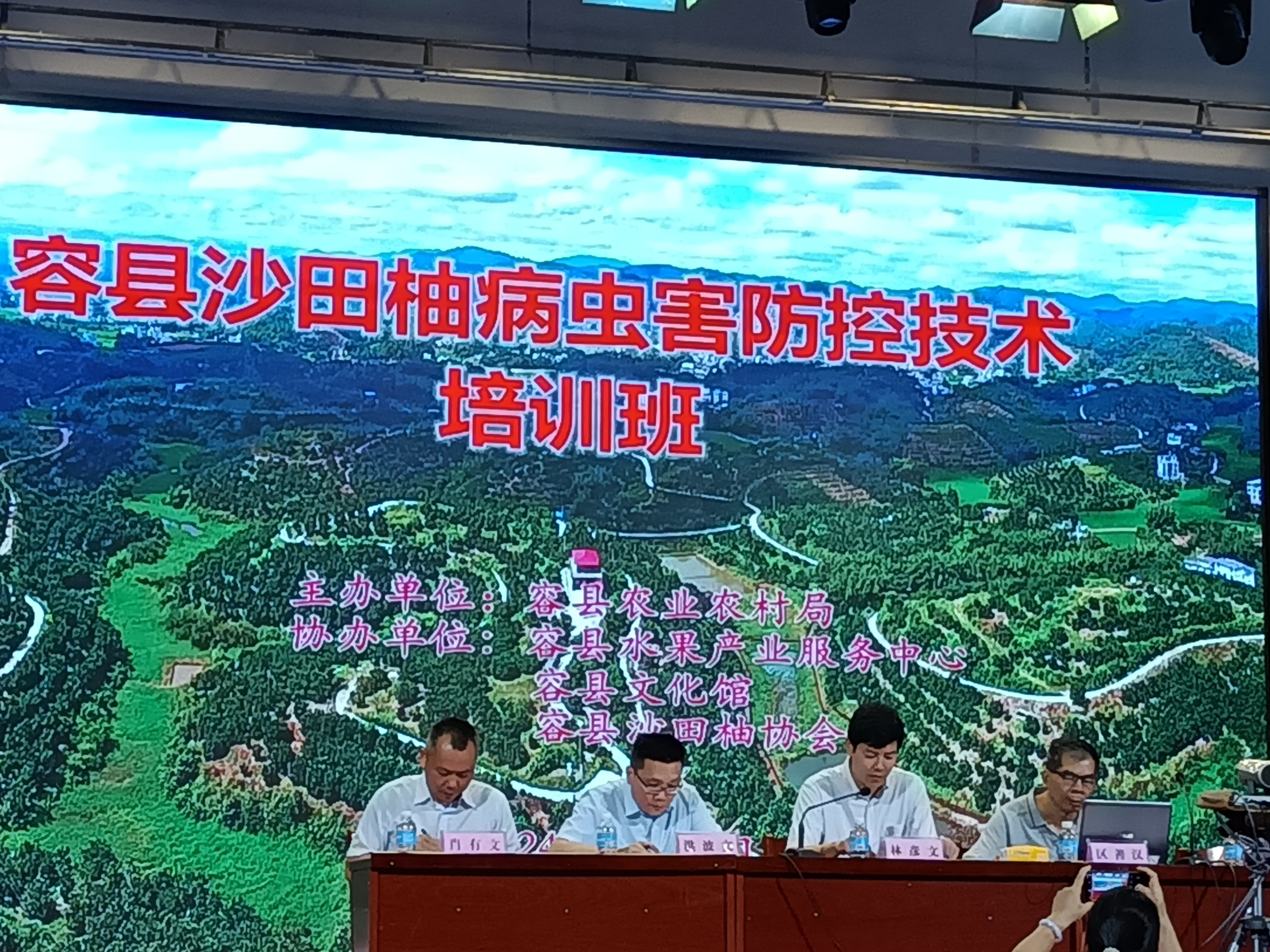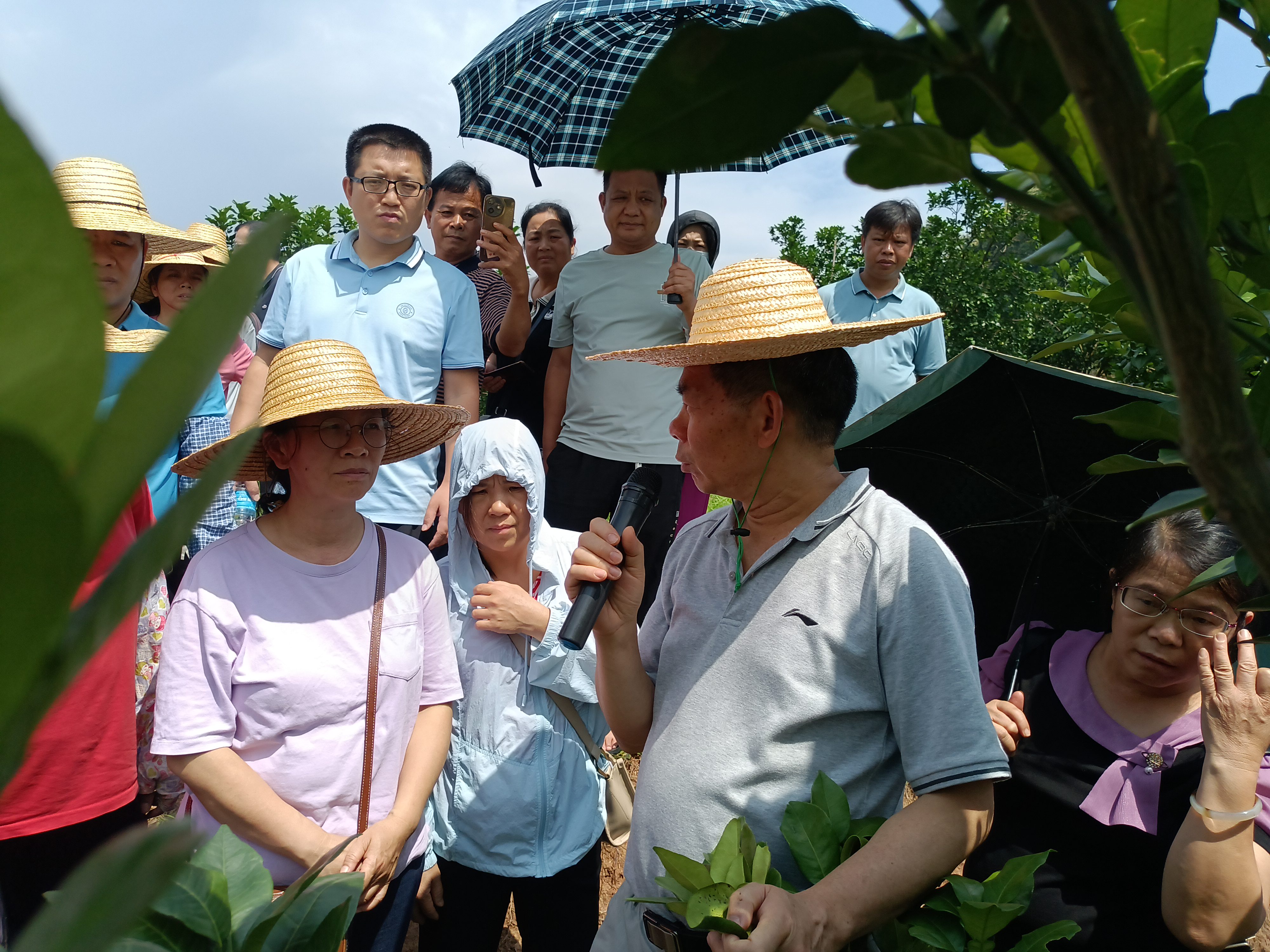 培训会同时进行了直播,为各村屯6000多名种植户提供线上培训。室内培训后,现场培训人员还到容州镇金库村沙田柚果园进行了黄龙病症状观察辨认、果园砍伐病树存在问题分析等现场讲解与交流。