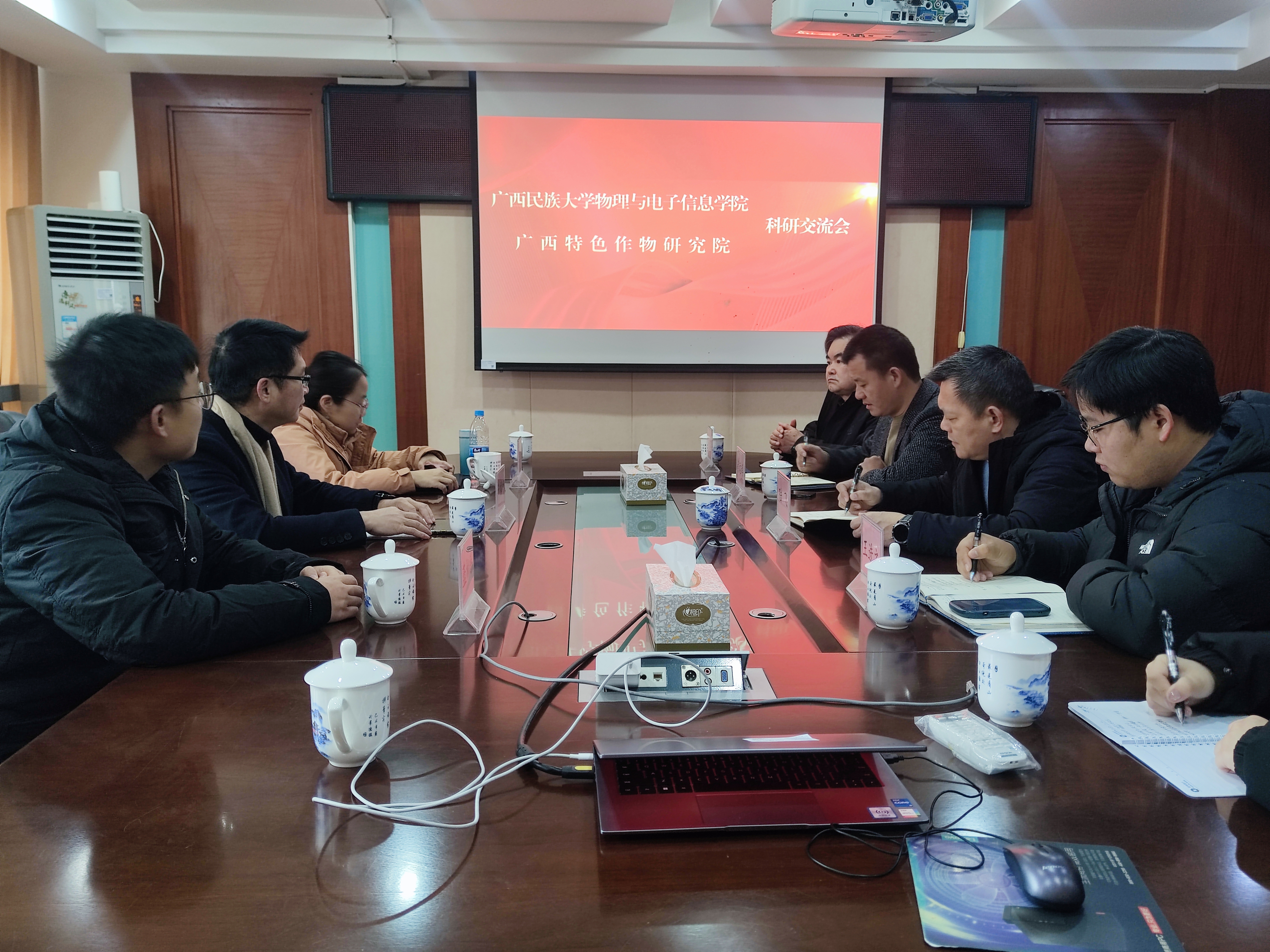 1月9日上午,广西民族大学物理与电子信息学院院长罗丽平一行4人来我院考察交流,广西特色作物研究院党总支书记、院长陆飞及相关人员参加交流活动。