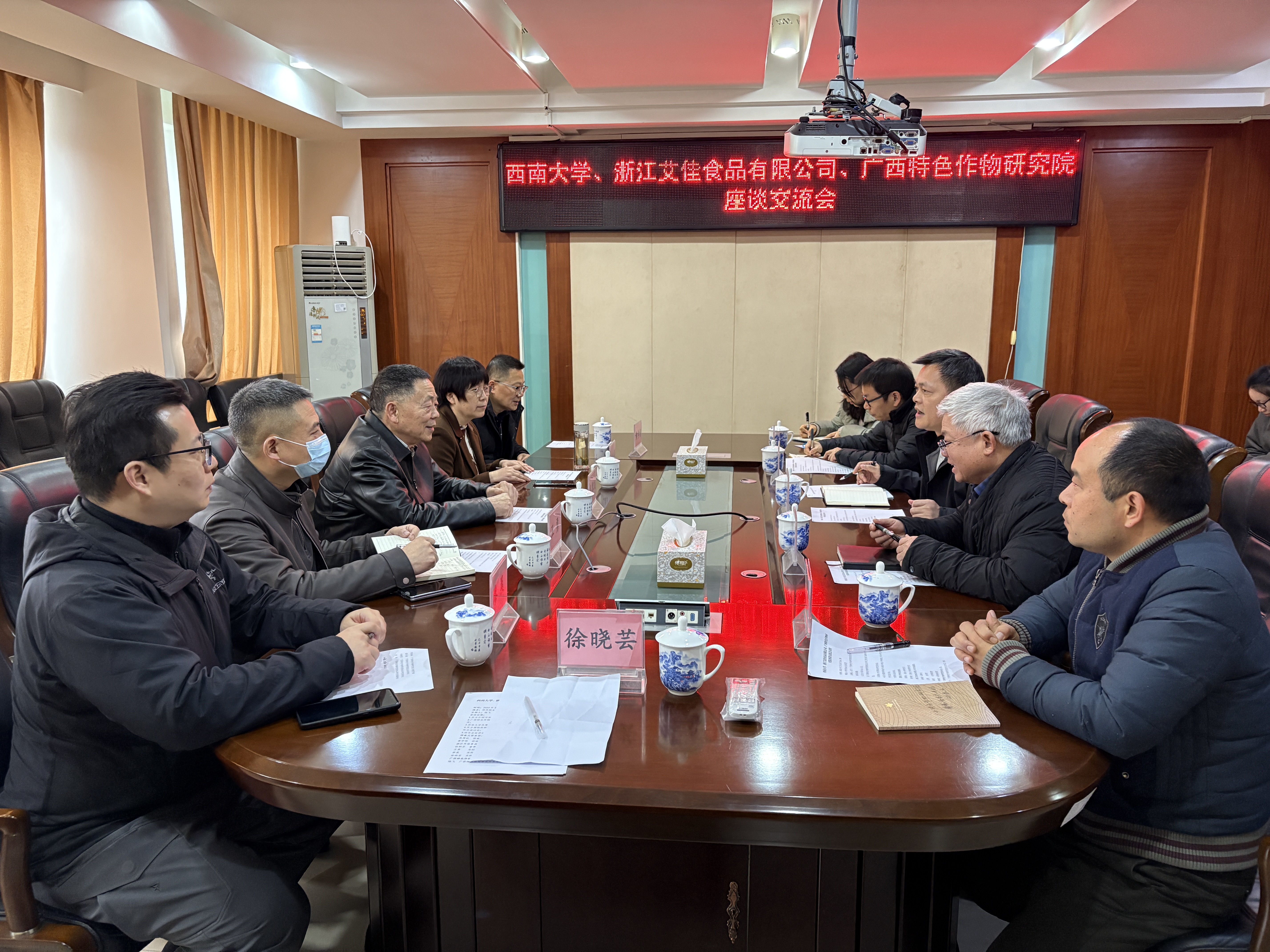 座谈会上,广西特色作物研究院院长陆飞对吴厚玖研究员一行的到来表示热烈欢迎,邓崇岭研究员向他们介绍了广西特色作物研究院平台建设和科技创新等情况。吴厚玖研究员分析了国内外果汁加工行业的发展形势,并就怎样开展果汁加工研究提出建议。浙江艾佳食品有限公司董事长介绍了企业的发展历程、业务范围,并就新产品开发、技术创新等合作进行了交流。