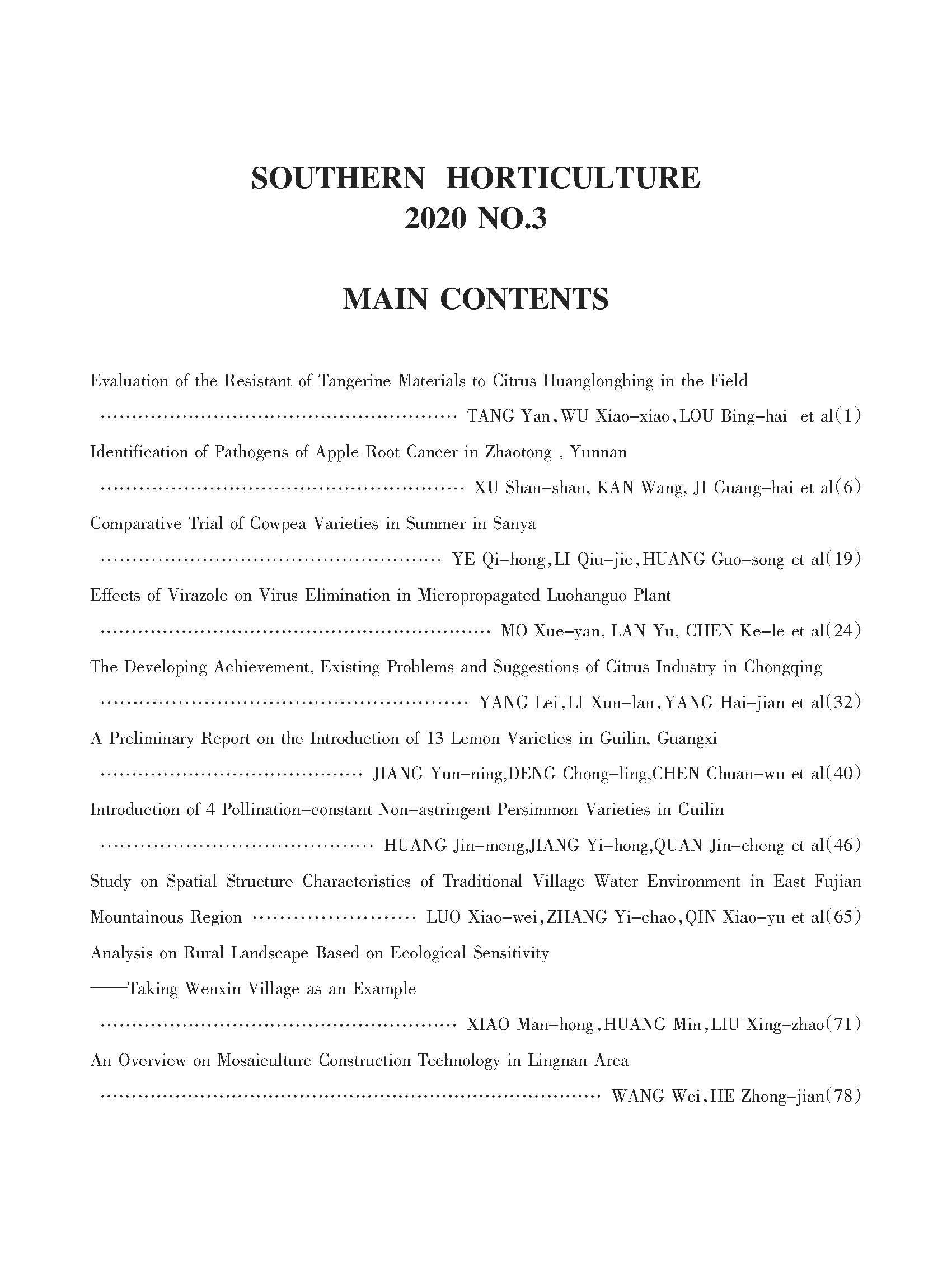 《南方园艺》2020年第3期英文目录