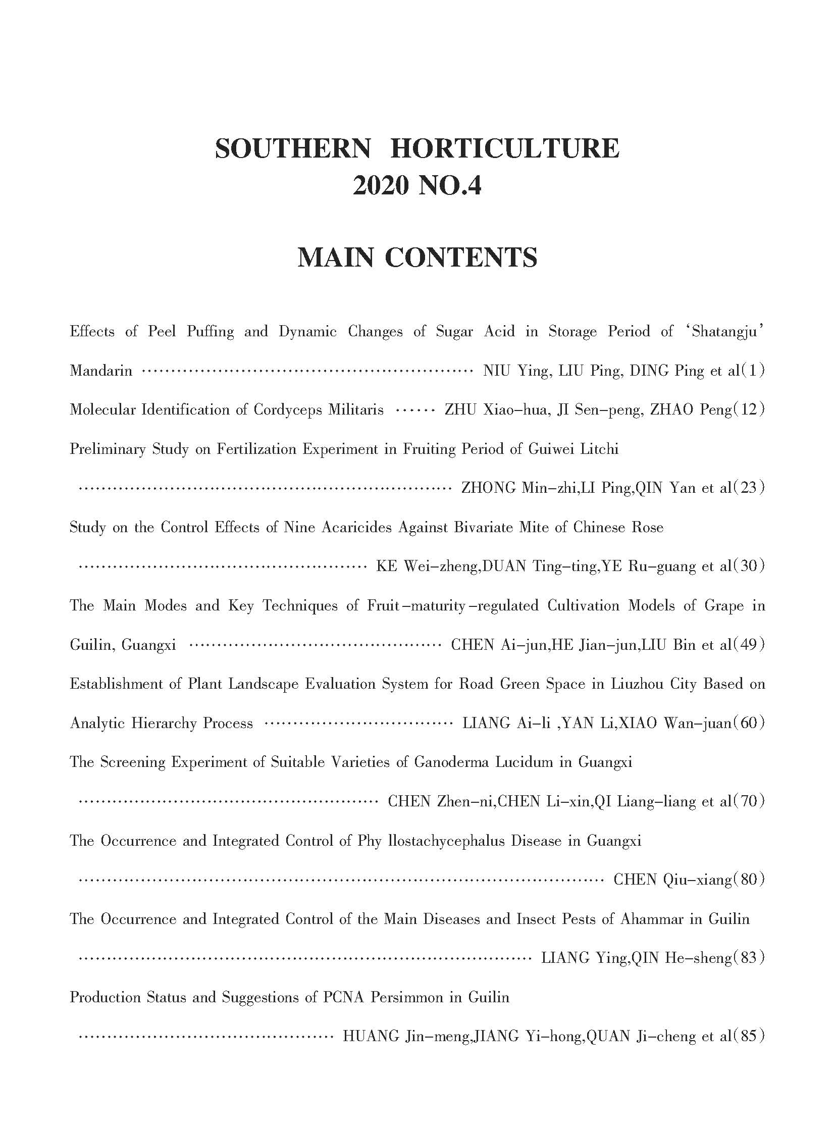 《南方园艺》2020年第4期英文目录