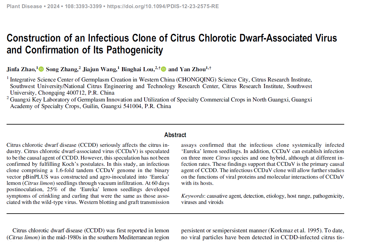 近日,我院柑橘病虫害可持续防控团队与西南大学柑桔研究所柑桔苗木脱毒中心在农林科学区期刊《Plant Disease(IF2023=4.4) 联合发表题为“Construction of an infectious clone of citrus chlorotic dwarf-associated virusand confirmation of its pathogenicity”的研究论文。
