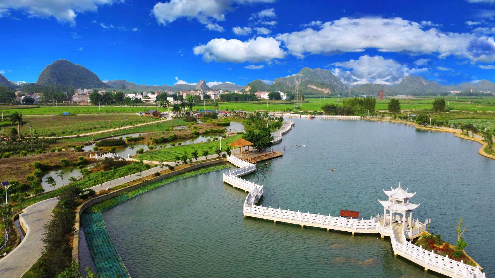 2.引资:多渠道吸收各方资金,有力推动产旅融合、农业发展和基础设施建设。一是动员群众进行土地流转,将村中土地 “小块并大块”,实现化零为整,加速传统农业向现代农业的转型。目前,已将6500多亩土地流转给进驻公司进行规模化经营,整村土地流转率高达95%以上,户年平均租金5000元以上。二是进驻公司依托田东县的金融改革政策,通过土地经营权抵押累计获得贷款2亿多元,为土地流转后农业生产的发展壮大提供了坚实的资金支撑。如今,模范村的香蕉基地已成为“全国一村一品示范村”的重要组成部分,成为带动模范片区及周边各村脱贫增收的重要平台。三是充分利用丰富的自然资源,成功争取产旅融合资金1000多万元,盘活合作社社员闲置资金280多万元、土地出租100多亩,用于开发龙潭灵湖。建成了集乡村旅游、特色农业、观光采摘、休闲度假、民俗体验、风情娱乐、摄影美食、劳动教育实践研学于一体的休闲农业与乡村旅游示范区。四是积极争取上级各部门的支持,成功获得标准农田建设、小流域综合治理、整合财政涉农资金、深百协作的乡村风貌改造等项目资金共计3000多万元。对山、水、林、田、湖、路进行综合性改造,核心村屯的农户房屋外立面改造已完成过半,整村面貌得到全面提升。
