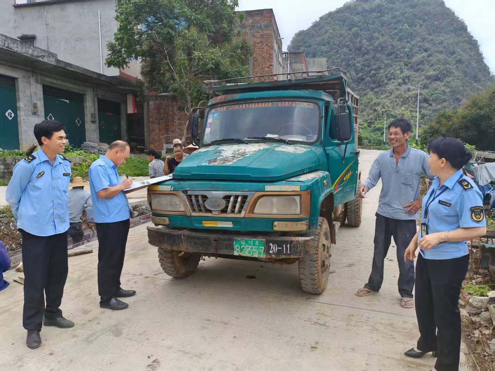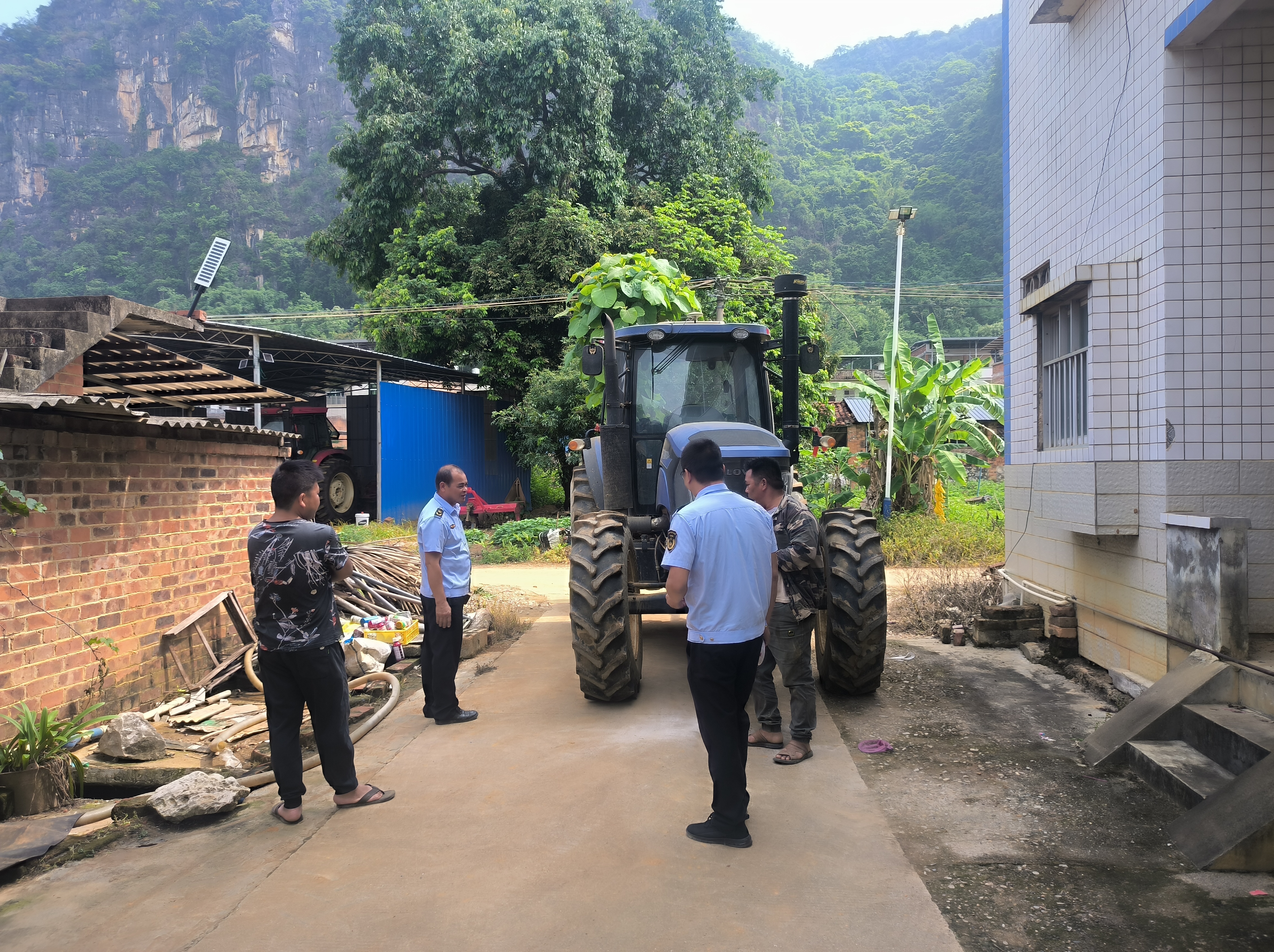 在天等县宁干乡工作人员开展路检路查及农机年检服务(天等县农业机械化服务中心提供)