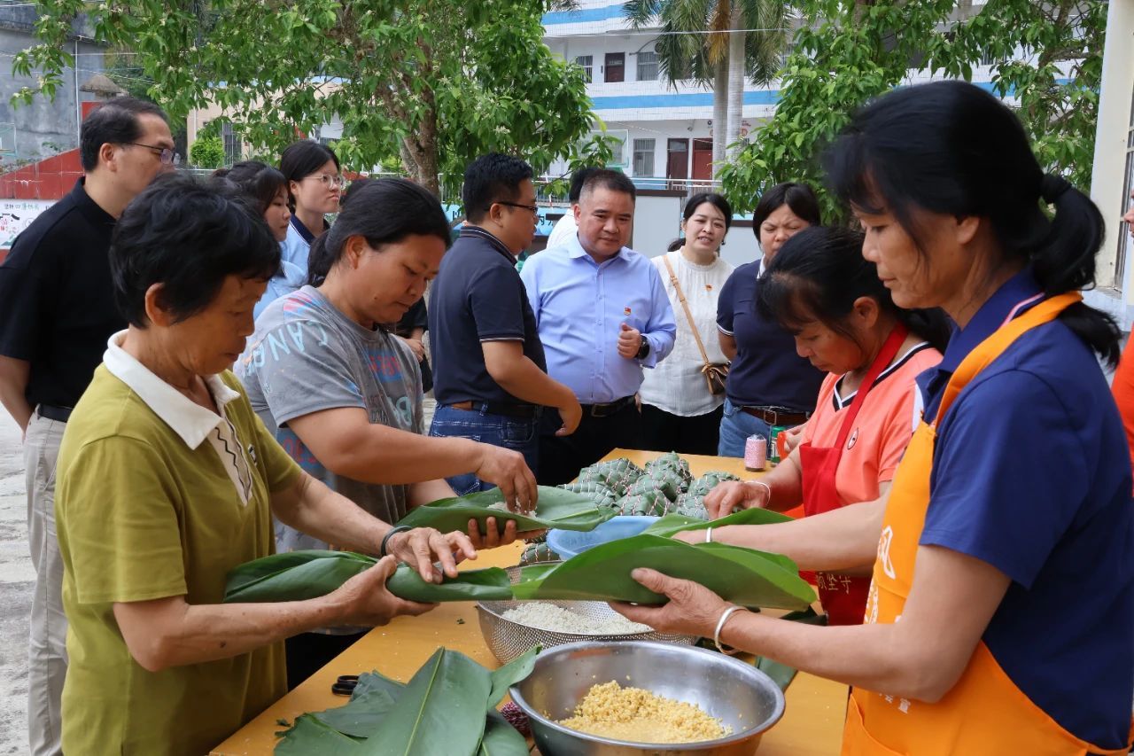 恰逢端午节来临,广西商业学校一行还与当地村民们一起包粽子,共话家常,现场洋溢着欢乐祥和的气氛。此外,他们还走访慰问了村里的老党员,为老党员们送去节日慰问品和诚挚的祝福,关切询问老党员的身体状况和生活情况,感谢他们为乡村发展做出的贡献,并叮嘱他们要保重身体。