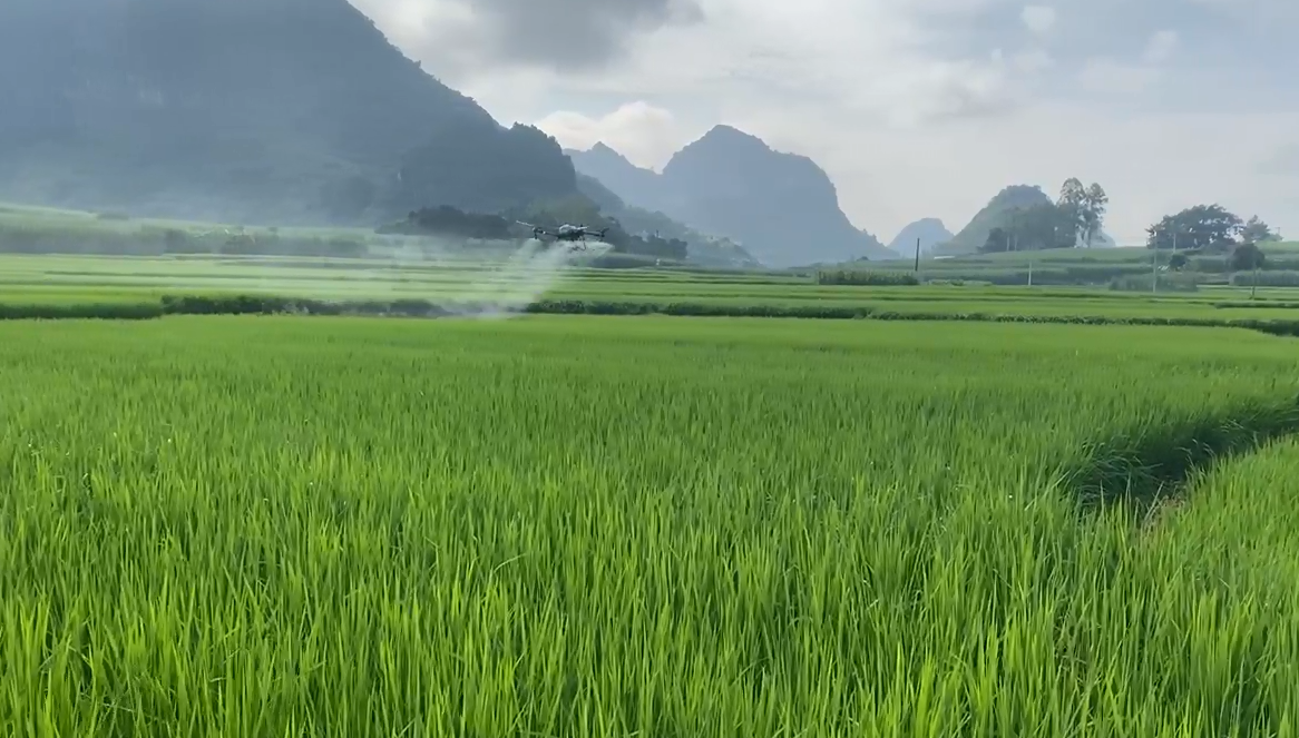 扶绥县渠黎镇那勒村无人机正在开展飞防、施肥作业(丰年农业公司供图)