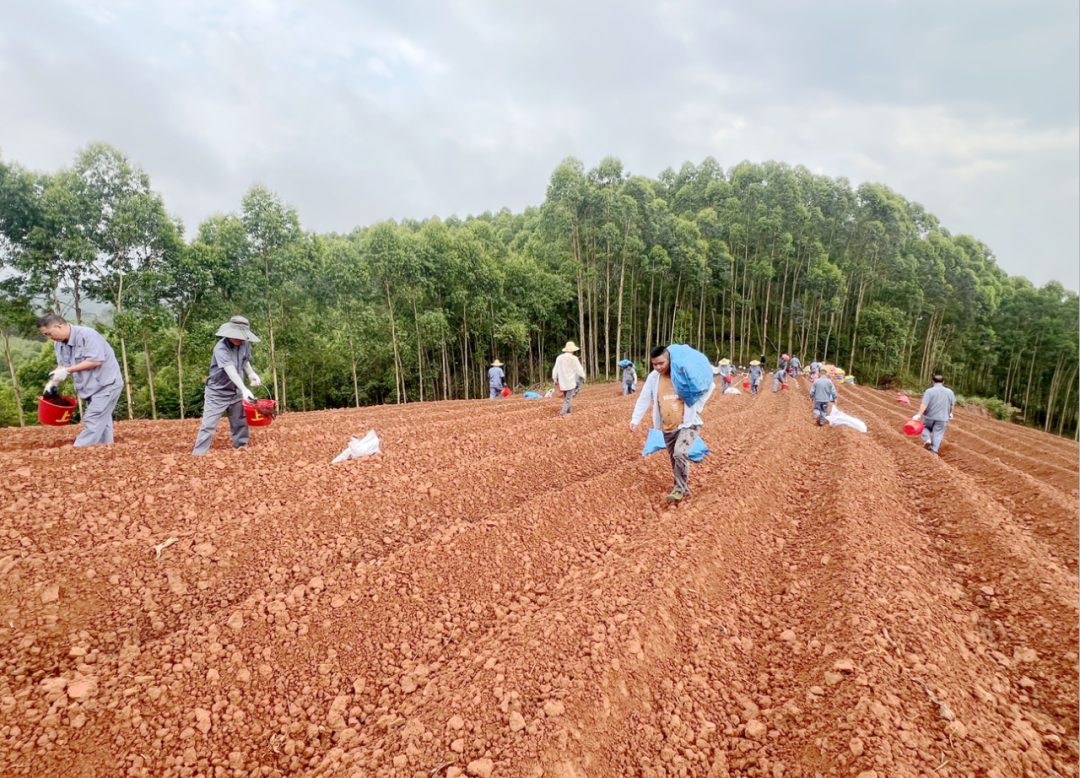 获知情况后,上上糖业党委迅速行动,协调做好肥料和蔗种调拨,组织30余名党团员组成“党团员突击队”,于5月6日至8日驱车奔赴该地块,帮助老农种植糖料蔗。该地块坡度较大,无法机械运输和机械种植。直面高强度体力劳动和高达33°C高温的挑战,大家以“这是我的地”的责任感,埋头苦干,任劳任怨。330包60多斤装的蔗种和600包50斤装的肥料硬是用肩扛反复来回搬运到位,撒肥、下种、覆土全是人工作业。经过三个大半天的艰苦奋战,高标准高质量地完成种植任务,赢得了群众的高度赞扬。