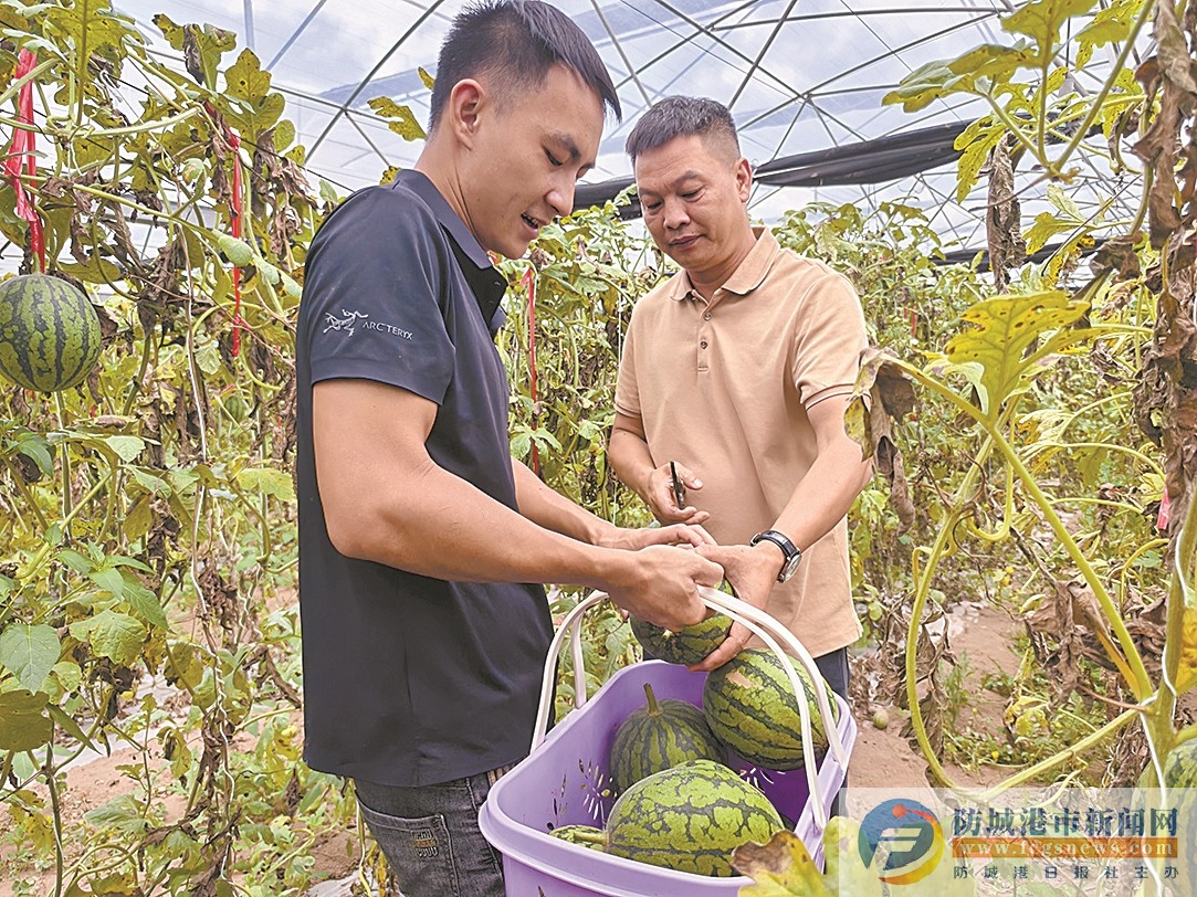 5月14日,记者踏入防城区华石镇冲敏村盛植采摘园的大棚,只见绿油油的藤蔓上挂满了青翠圆润的西瓜。工人们穿梭其中,忙着采摘、打包、装箱,一幅繁忙而喜悦的丰收景象。