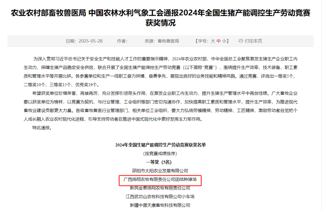 喜报!广西扬翔农牧有限责任公司团结种猪场荣获2024年全国生猪产能调控生产劳动竞赛一等奖