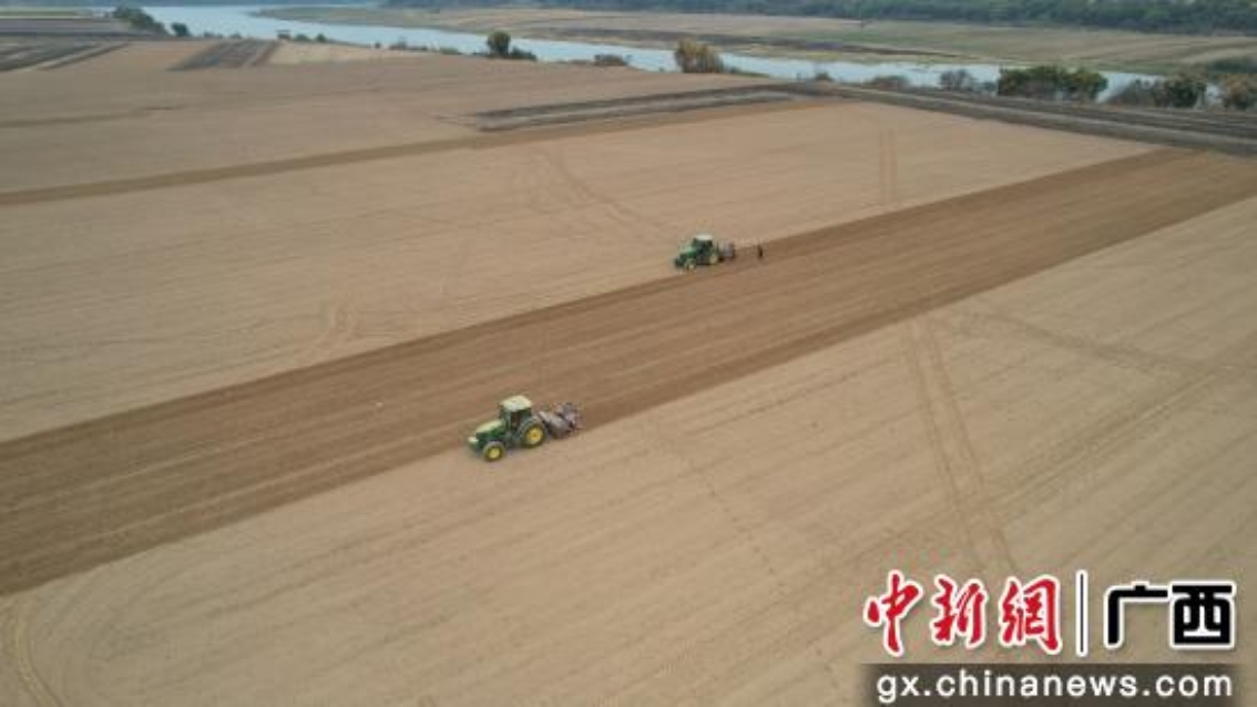2月10日,记者来到象州县运江镇芽村的千亩连片甘蔗种植基地,2台安装有北斗导航辅助驾驶系统的拖拉机在蔗田里来回穿梭,一次性完成开沟、下种、施肥、覆土等工序。