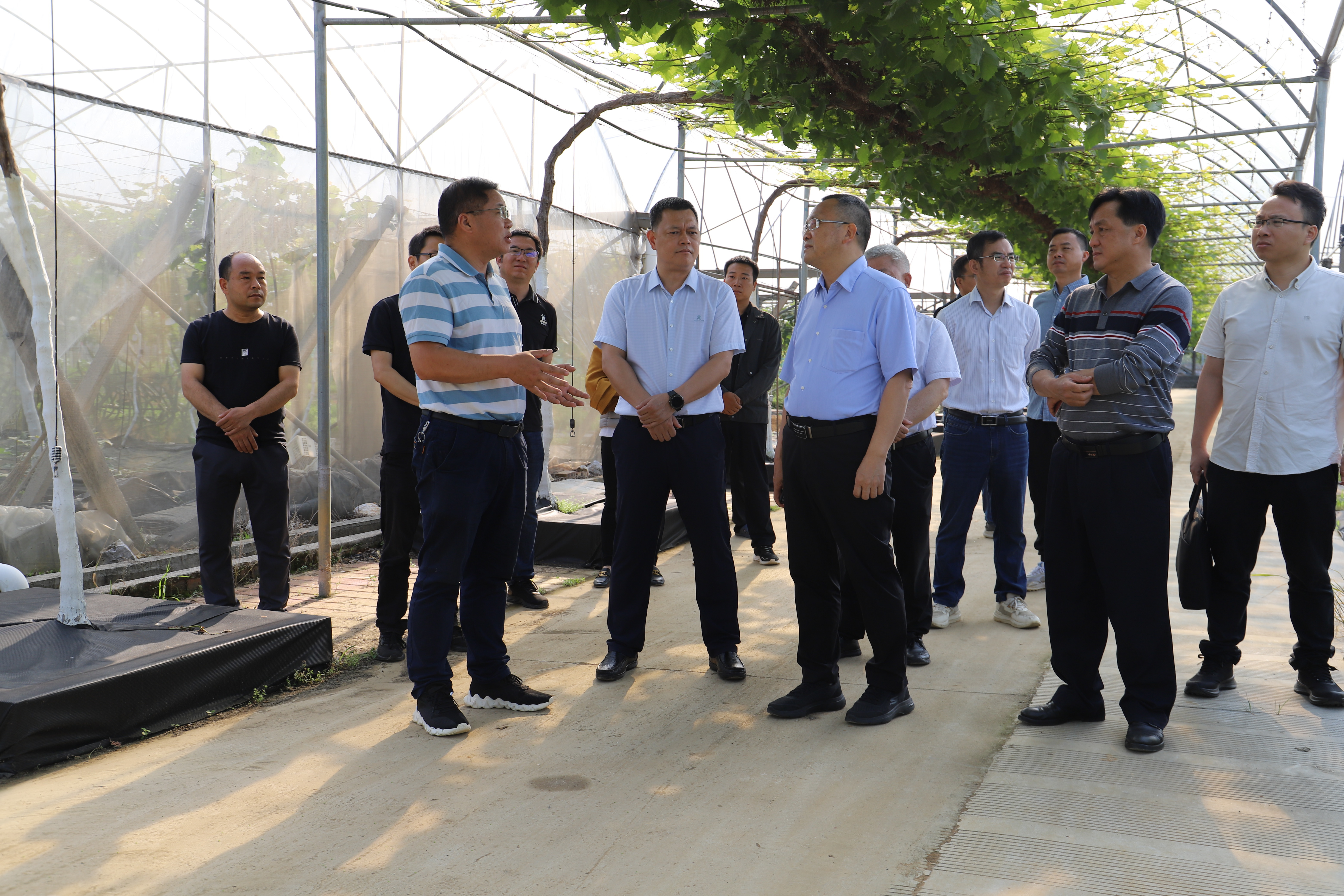 唐咸来一行实地考察广西特色作物研究院落叶果树科研示范园,详细了解桃、梨、葡萄等果树品种培育、高效栽培技术及种植模式试验示范等情况。