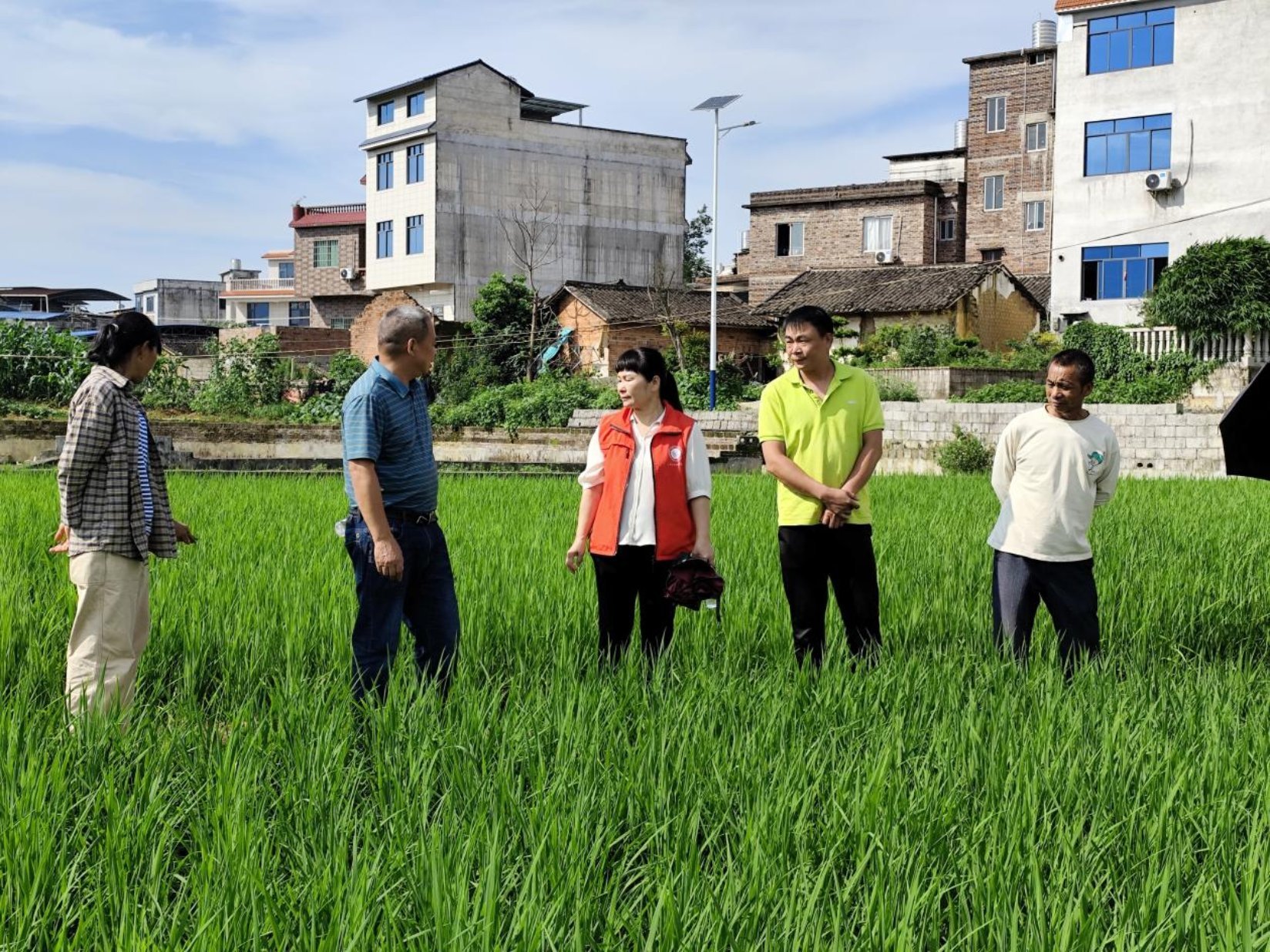 图:本土专家贺州市八步区农科所所长、高级农艺师何青石(左二)、贺州市平桂区成人直播 局人事科教股股长、科技特派员徐青蓉(高级农艺师)深入沙田镇道西村田间地头开展水稻田间管理现场指导。