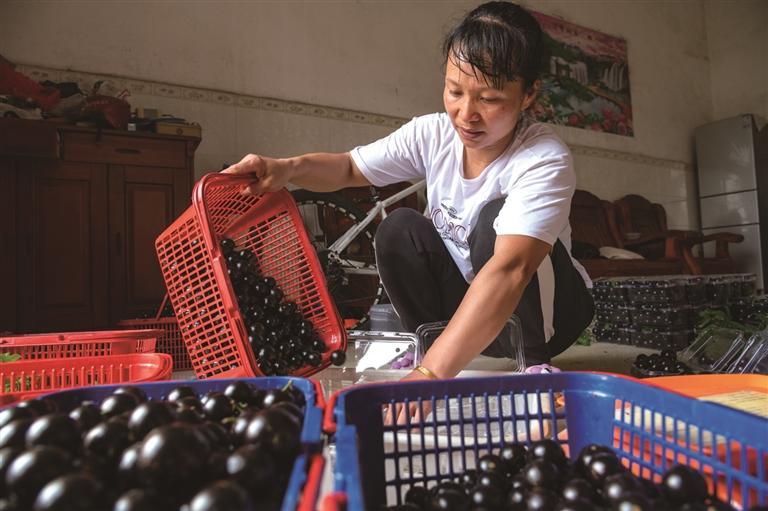 另一边,种植户韦小情正麻利地将嘉宝果按大小分装,边装边说:“地头收购价15元一斤,入园采摘能卖到40元一斤!”