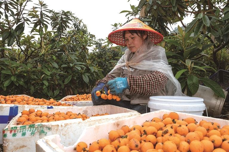 在柳城县沙埔镇的枇杷园,种植户正在分拣枇杷。