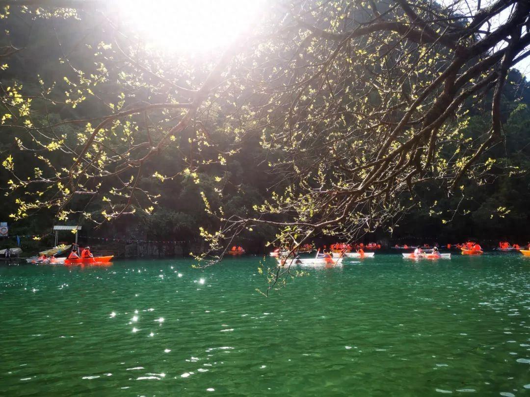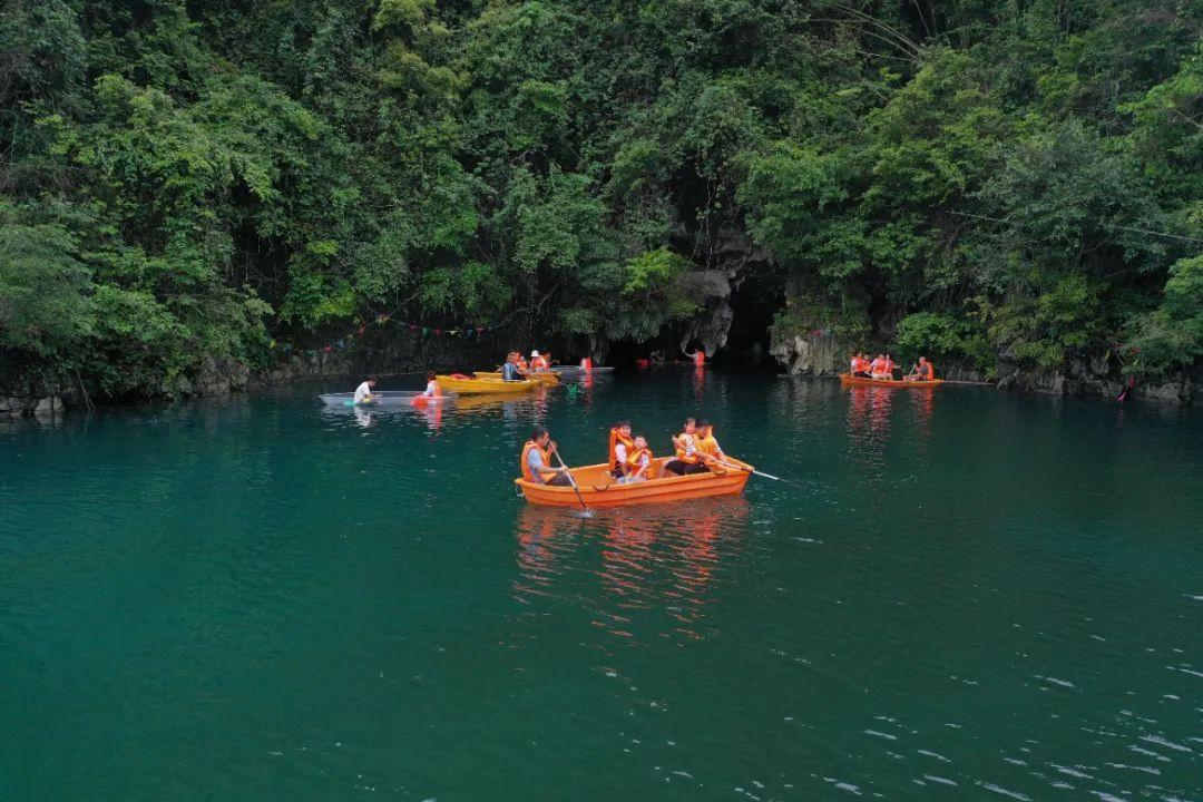 位于柳江区土博镇水源村的狼口泉,凭借其独特的自然风光,成为“柳版九寨沟”十大景点之一,被誉为“柳州天池”。这里群山环抱,空气清新,从高空俯瞰,碧绿的水潭宛如一块镶嵌在山间的碧玉。潭水清澈见底,青山倒映其中,游客乘小舟划向神秘洞口,仿佛置身于奇幻仙境。端午假期,狼口泉吸引众多游客前来打卡,周边城市的游客也纷纷前来开展团建活动,景区内游客络绎不绝,每日有多辆旅游大巴到访。狼口泉景区负责人韦汉良表示,看到家乡旅游业发展蒸蒸日上,村民们对发展“家门口”旅游业充满信心。
