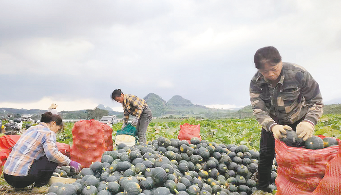 初夏时节,武鸣区双桥镇八桥村大伍屯和宁武镇旧岑村的南瓜种植基地里,南瓜叶郁郁葱葱,个头不大的南瓜就藏在叶子间,村民忙着采摘、打包、装车、运输,将幸福感转化为笑容展现在脸上,丰收的画卷已然展开。