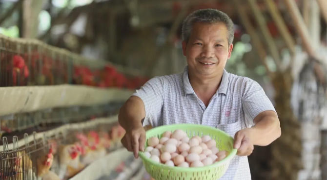 岑溪市致臻生态养殖有限公司负责人 覃勇志:“岑溪三黄鸡是我们国家地理标志产品,这么好的资源不能浪费。我们采用‘公司+农户’模式,统一供苗、供料、包回收,现在全镇60多户养殖户,年销售肉鸡60万羽,营业额超2500万元。”