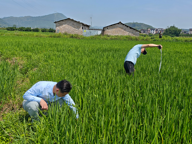在妙华农业发展有限公司水稻无人机直播基地,中心干部进行仔细测量,追踪记录水稻无人机直播后续生长相关数据。指导组在现场与技术员进行深入交流,详细记录遇到的问题和困难,对水稻生长后续工作和防范自然灾害提出针对性意见和建议。