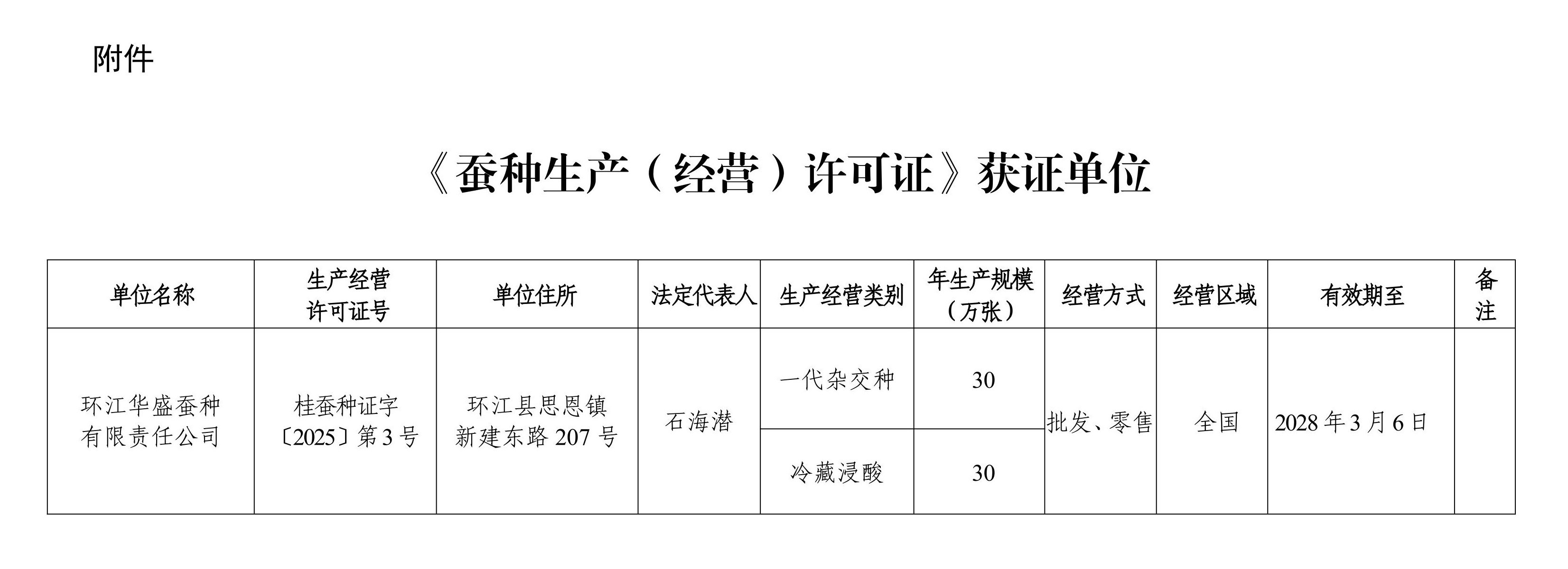 根据《中华人民共和国畜牧法》(2005年主席令第四十五号,2022年修订)、《蚕种管理办法》(2006年农业部令第68号,2022年修订)、《广西壮族自治区蚕种管理条例》(广西壮族自治区第十二届人民代表大会常务委员会第二十二次会议通过,广西壮族自治区第十四届人民代表大会常务委员会第十三次会议修改)和《广西壮族自治区蚕种生产经营许可管理办法》(桂农厅规〔2021〕3号)有关规定,经审核,环江华盛蚕种有限责任公司符合蚕种生产(经营)许可发证条件,批准发放蚕种生产(经营)许可证(详见附件),现予公告。