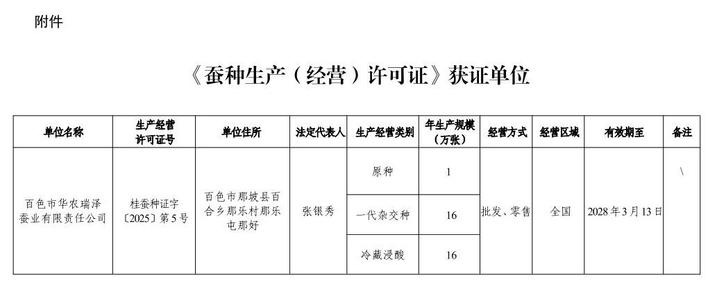 根据《中华人民共和国畜牧法》(2005年主席令第四十五号,2022年修订)、《蚕种管理办法》(2006年农业部令第68号,2022年修订)、《广西壮族自治区蚕种管理条例》(广西壮族自治区第十二届人民代表大会常务委员会第二十二次会议通过,广西壮族自治区第十四届人民代表大会常务委员会第十三次会议修改)和《广西壮族自治区蚕种生产经营许可管理办法》(桂农厅规〔2021〕3号)有关规定,经审核,百色市华农瑞泽蚕业有限责任公司符合蚕种生产(经营)许可发证条件,批准发放蚕种生产(经营)许可证(详见附件),现予公告。