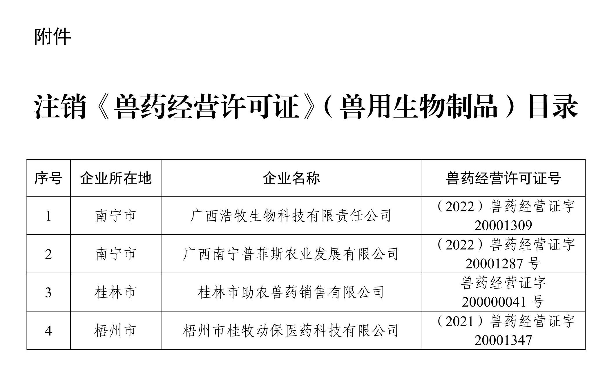 广西浩牧生物科技有限责任公司、广西南宁普菲斯农业发展有限公司、桂林市助农兽药销售有限公司、梧州市桂牧动保医药科技有限公司申请注销其《兽药经营许可证》(兽用生物制品)。根据《中华人民共和国行政许可法》《兽药管理条例》相关规定,现予注销。