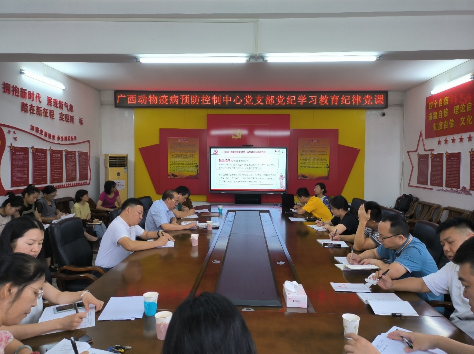 6月18日,广西壮族自治区动物疫病预防控制中心党支部召开全体党员大会,中心党支部书记紧紧围绕党纪学习教育要求,为党员干部上了一堂专题党课。中心班子成员,全体党员和中层干部参加了此次会议。