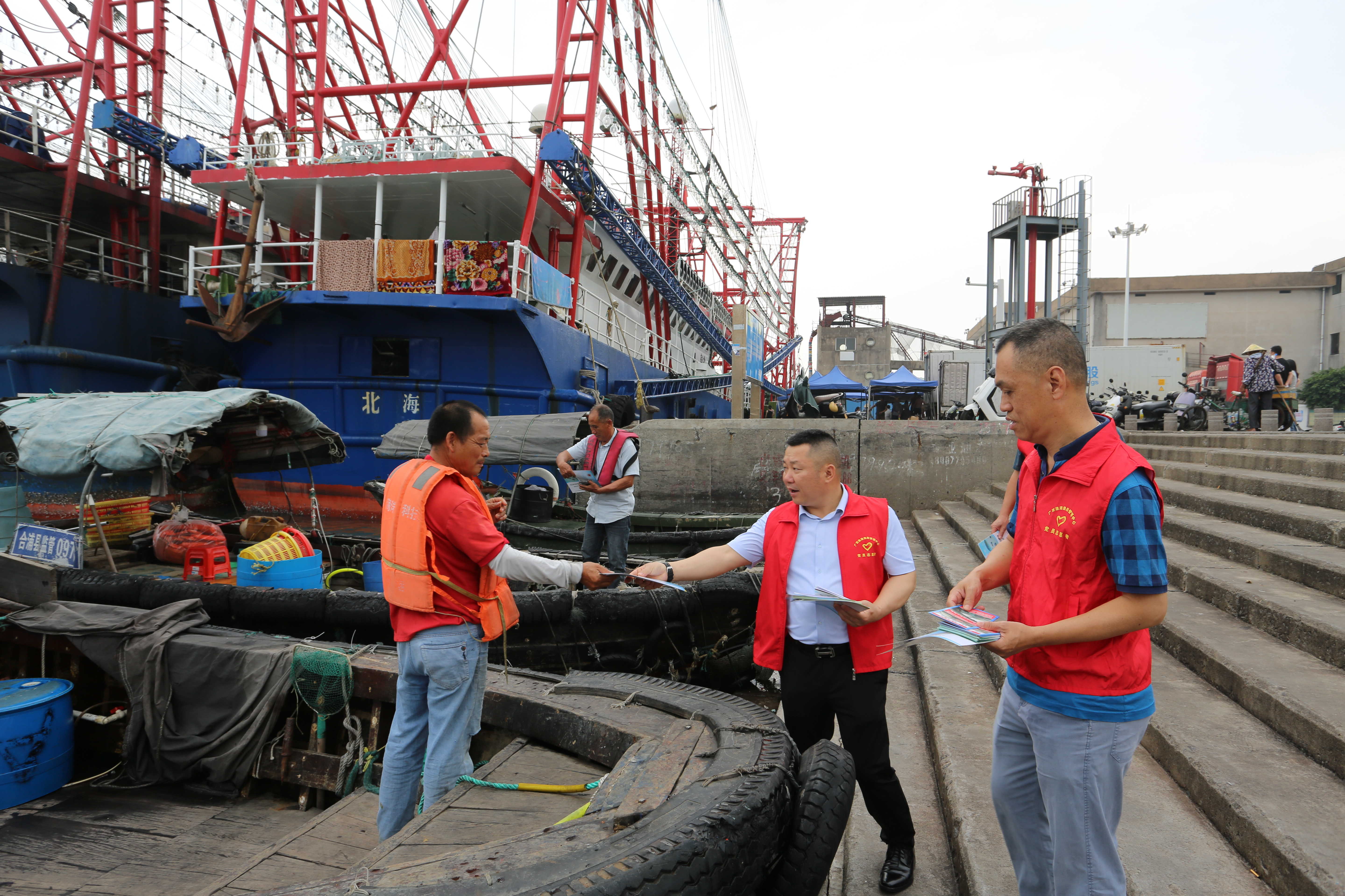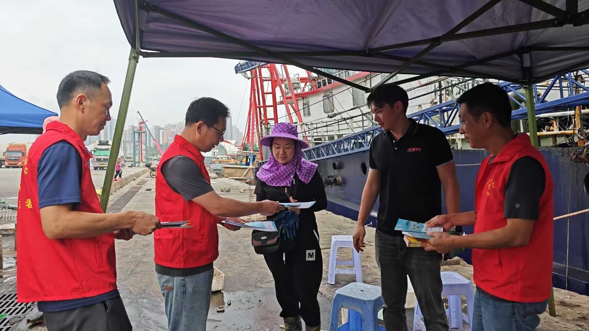 志愿者向船东船员发放休渔安全、渔船进出港报告等宣传资料